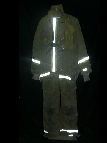 From the TV series 'Emergency!' (1972-1979), this is a background firefighter's jacket and pants. The outfit is an actual firefighter's suit, complete with metal hooks and clasps and is made from extremely heavy fabric. The jacket has 'Los Angeles City Fire Dept.' and the name 'Calvillo' stenciled on the back. 'BG' is written in ink on inside neckline. The pants are also heavy, layered fabric and has 'Ignatczyk' written inside the waistline. The outfit has definitely seen some action.