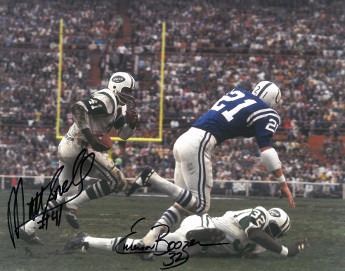 Emerson Boozer played his entire professional career with the Jets. Boozer was a member of the Jets team that defeated the NFL's champion Baltimore Colts, 16-7, in Super Bowl III. Jets coach Wilbur 'Weeb' Ewbank utilized Boozer in pass blocking schemes then new to football. In blocking for both Matt Snell and Joe Namath, Boozer was part of two outstanding teams that narrowly lost just three games in 1968 and went 10-4 in 1969. In his rookie year with the New York Jets, Snell rushed for a team-record 180 yards against the Houston Oilers on his way to a 945-yard season and AFL Rookie of the Year honors. Snell went on to become an AFL Eastern Division All-Star in 1964 and 1966, and the Sporting News All-AFL fullback in 1969. Emerson Boozer & Matt Snell have both hand autographed this 8x10 Photo. Certificate of Authenticity from Athlon Sports.