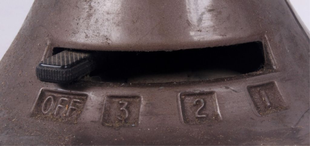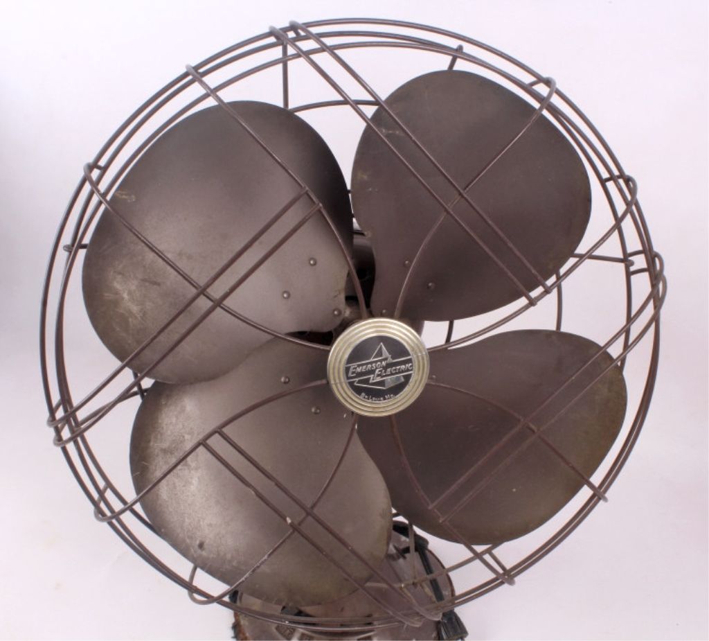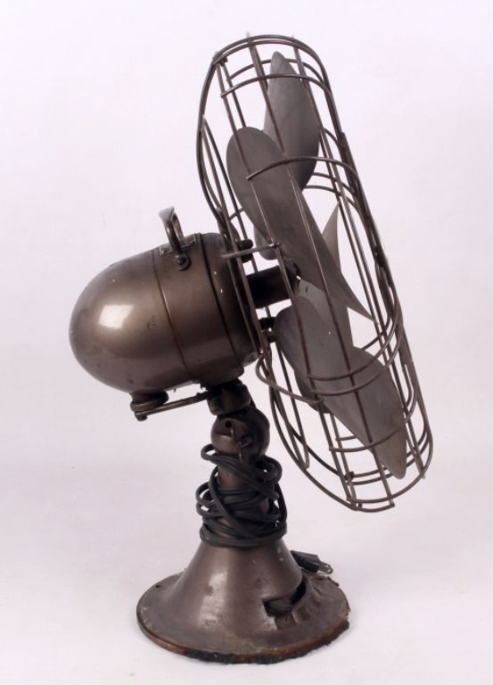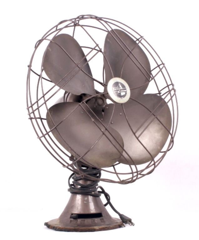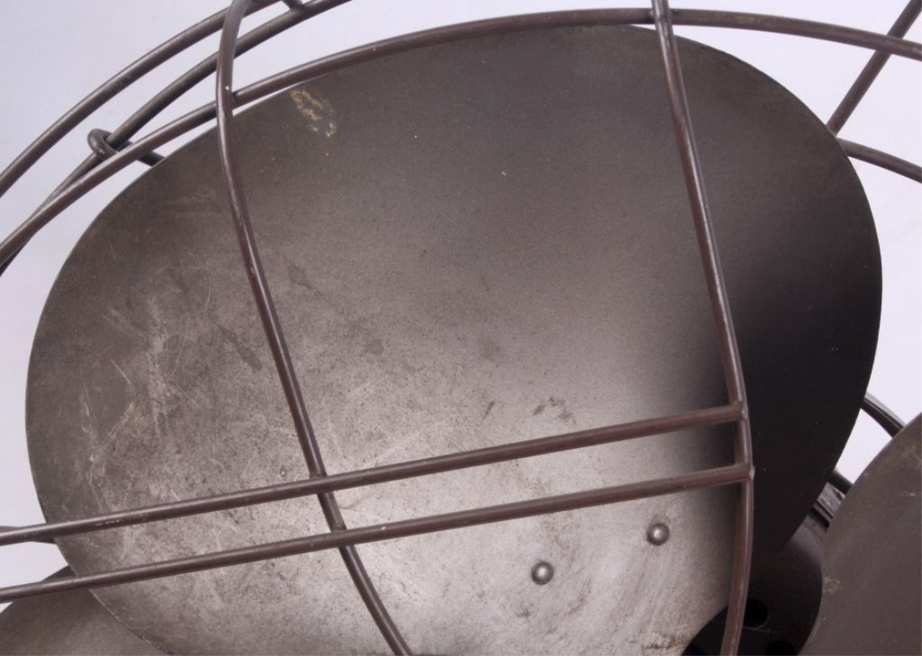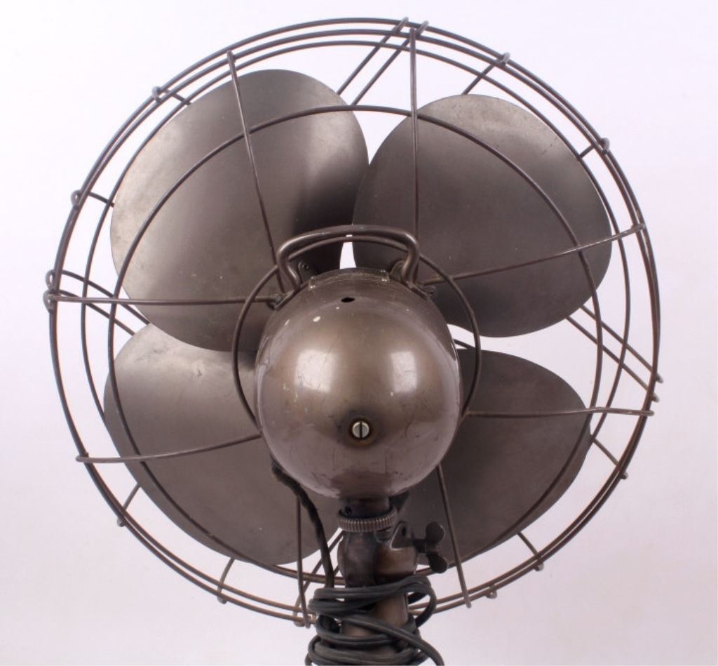 This lot features an oscillating desk fan. It has a great Art Deco style. It measures 17" in diameter and stands 21.5" tall.