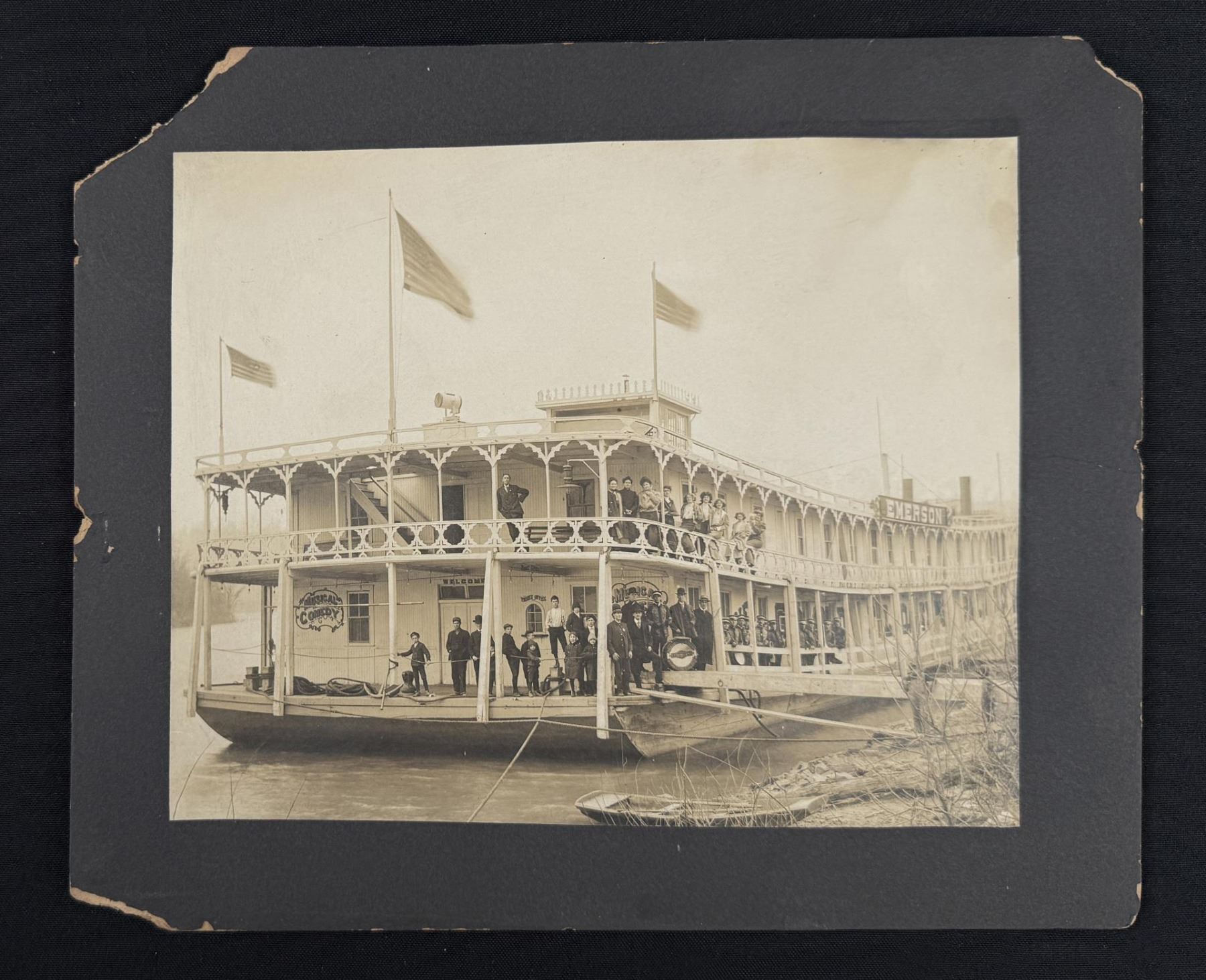 10" by 12". The steamboat Emerson was towing a floating palace when it struck an obstruction and sank near Osceola (Mississippi County) on October 3, 1908; one person was killed in the accident. The Emerson was a sternwheel paddleboat built as the Moline at Cincinnati, Ohio, in 1880. The 140-foot-long, twenty-six-foot-wide vessel was owned by Dimock, Gould & Co. of Moline, Illinois, and worked along the upper Missouri River. In the summer of 1900, the Kansas City Navigation Company acquired the Moline and converted the vessel into an excursion boat. Captain Ralph Emerson and a partner bought the steamboat in 1907 and renamed it the Emerson in February 1908, using the vessel to tow Emerson’s Floating Palace, a traveling entertainment venue. One newspaper noted that Captain Emerson’s new purchase, the steamer Moline, is the most powerful and biggest steamboat towing a showboat. The Emerson towed the palace along several waterways for performances of music, plays, and other acts at riverfront towns. A Paducah, Kentucky, newspaper wrote after a visit from Emerson’s Floating Palace that everybody was astounded at the mysterious act of the Hindoo troop. They swallowed swords and Victorina swallowed a gun barrel, which was discharged while it was down his throat. The palace was at Caruthersville, Missouri, on September 28, 1908, and a local paper wrote that it was better than most river shows and was considerate enough not to seat negroes with the whites, which was greatly appreciated by our people. Five days later, the Emerson was steaming down the Mississippi River when it struck a sandbar near Osceola and swung about, hitting a mattress used to prevent riverbank erosion sideways and turned turtle, sinking in sixty feet of water. One person different accounts say an actor, the calliope player, or simply a member of the traveling troupe was drowned in the accident. The wreckage of the Emerson blocked the channel of the Mississippi, but by October 12 the snag boat H. G. Wright removed part of the wreck of the steamer Emerson and reopened the waterway. The steamboat was a total loss and the theater was damaged to the extent of several thousand dollars.
