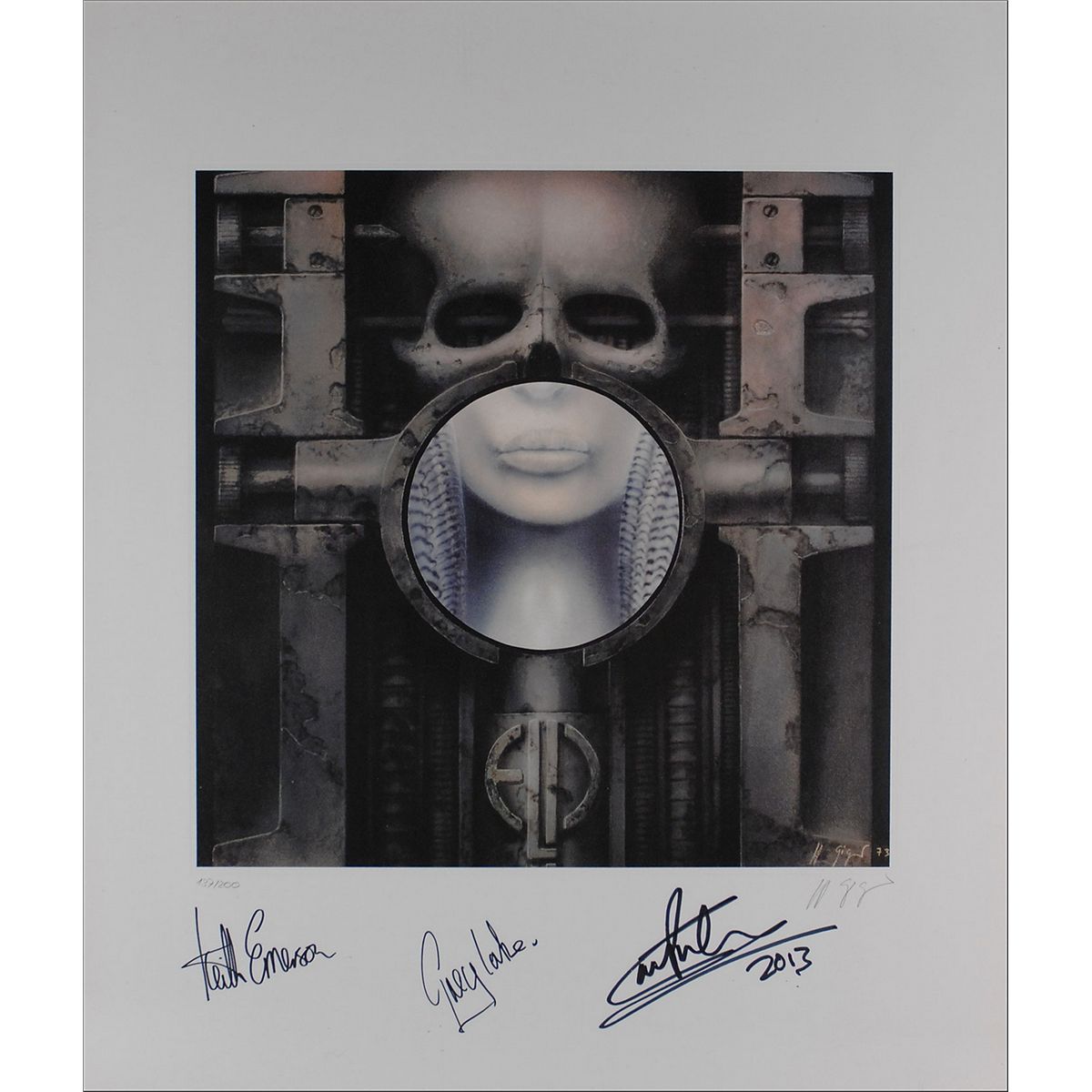 Color limited edition 22.5 x 26.5 print of the cover art for their Brain Salad Surgery album numbered 137/200, signed in the lower border in black felt tip by Keith Emerson, Greg Lake, and Carl Palmer. Also signed in pencil by the artist H.R. Giger. Rolled and in fine condition. These prints were not originally issued as signed by all three band members, rendering this example a rare find.