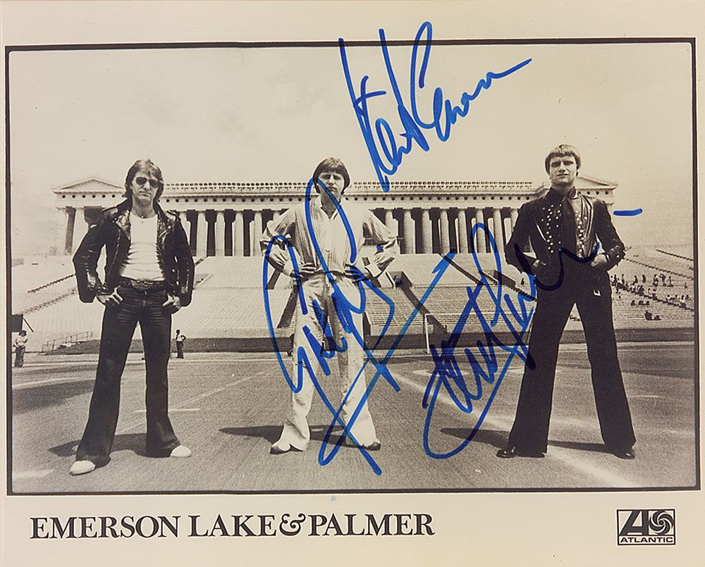 Satin-finish 10 x 8 Atlantic Records promotional photo of the band posing outdoors, signed in person in blue felt tip by Keith Emerson, Greg Lake, and Carl Palmer. In very fine condition. Originally obtained by in-person specialist Mike Wehrmann.