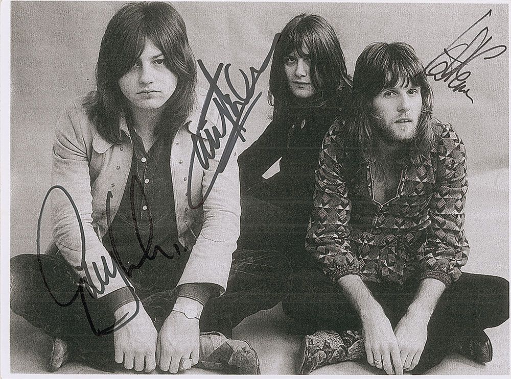 Laserprint 11 x 8.25 photo of a magazine photo, signed in black felt tip by Keith Emerson, Greg Lake, and Carl Palmer. In fine condition.