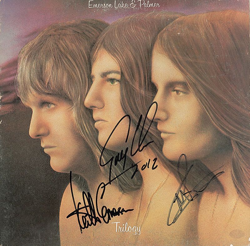Trilogy album signed on the front cover in black felt tip by Keith Emerson, Greg Lake, and Carl Palmer. In fine condition, with scattered light edge wear, small adhesive remnant to lower right corner, and some surface loss along spine. The record is included.