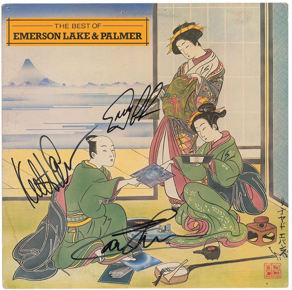 The Best of Emerson Lake & Palmer album signed on the front cover in black felt tip by Keith Emerson, Greg Lake, and Carl Palmer. In fine to very good condition, with small holes to top and bottom edges, dampstaining to lower left corner, adhesive remnants to the upper right from price tag removal, and a JSA label affixed to the back cover. The record is included. Accompanied by a certificate of authenticity from JSA.