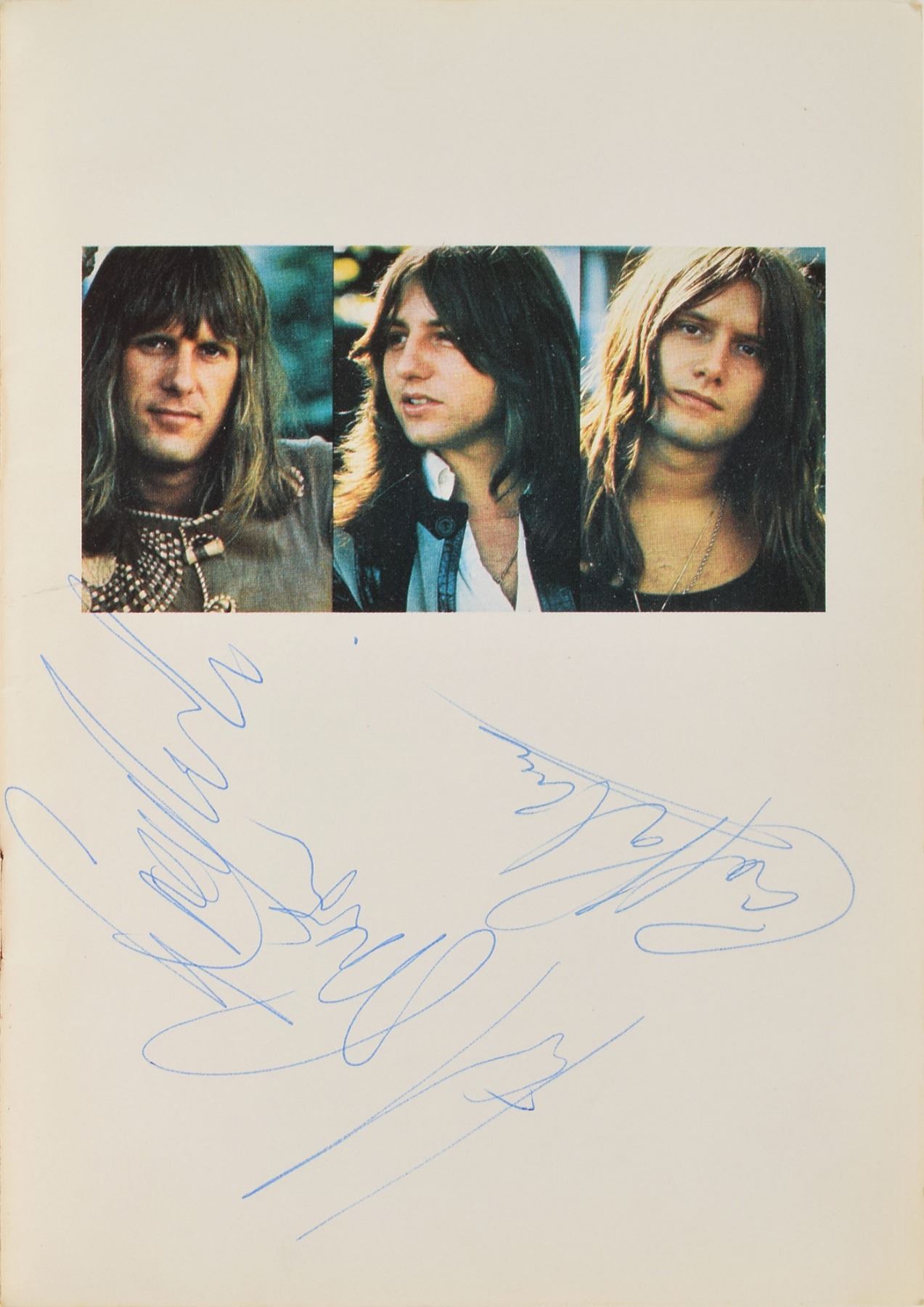 Vintage program for Emerson, Lake & Palmer's 1971 live album Pictures at an Exhibition, 5 x 7, signed inside in blue ballpoint by Greg Lake, Carl Palmer, and Keith Emerson, who also signs on the front cover. In fine condition, with light soiling, and a stray ink mark, to the cover.