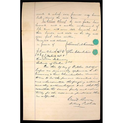 <Our item number 139979><B>Emerson, Samuel N. -- Hawaiian Monarchy Real Estate Lease.</B> 12½ x 8 in., 1875, October 1, 4 pp. Transaction with Levi Chamberlain leasing Mokuleia, Waialua Oahu, Hawaii described in Royal Patent No. 261. Signed by the following: Samuel N. Emerson; Levi Chamberlain, William Smith, A. S. Hartwell, Cecil Brown, and Thomas Brown. Chamberlain was a member of the Second Company of American missionaries that arrived in Honolulu in 1823. Smith served as sheriff of Kauai and Maui, was in the Hawaiian Legislature and served as Attorney General and President of the Board of Health. Hartwell was a Justice of the Supreme Court from 1868-1874. Brown served as Attorney General under the Hawaiian monarchy and was often called upon to advise King Kalakaua. <BR>Estimated Value $300 - 400. <BR><BR>Our item number 139979<BR><IMAGES><P ALIGN="CENTER"><IMG SRC="http://www.goldbergcoins.net/liveauction/49jpegs/139979.jpg"> </P></IMAGES>