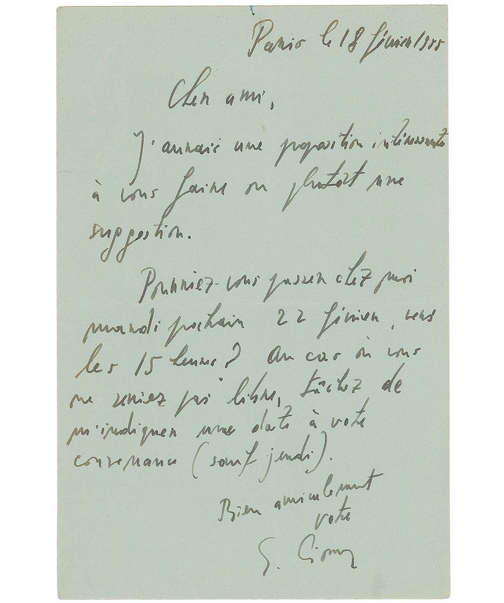 Romanian philosopher and essayist (1911–1995) who was awarded the prestigious Rivarol Prize in 1950 for his first French book, A Short History of Decay. ALS in French, signed “E. Cioran,” one page, 4 x 6.25, February 18, 1955. In full (translated): “I have an interesting proposition for you or rather a suggestion. Could you go with me next Tuesday, February 22 at 3 o’clock? In case you are not free, try to give me a date at your convenience (except Thursday).” In fine condition. In 1955, Cioran was working on a collection of writings of Joseph de Maistre, which were published two years later by Editions du Rocher. A scarce autograph—the first Cioran we have offered.