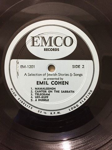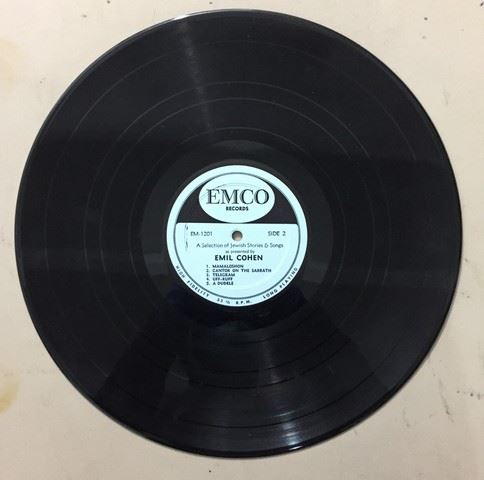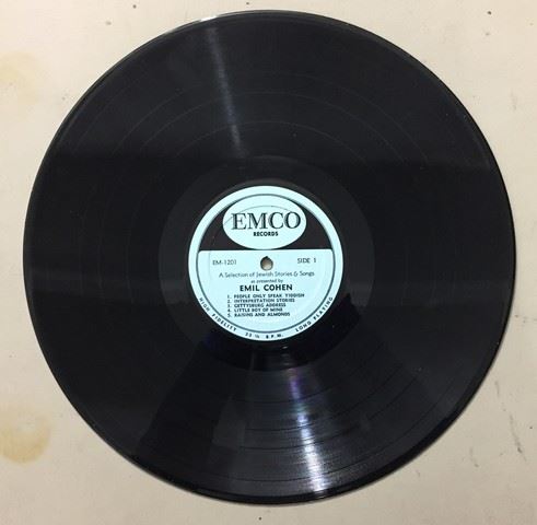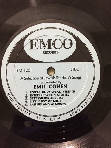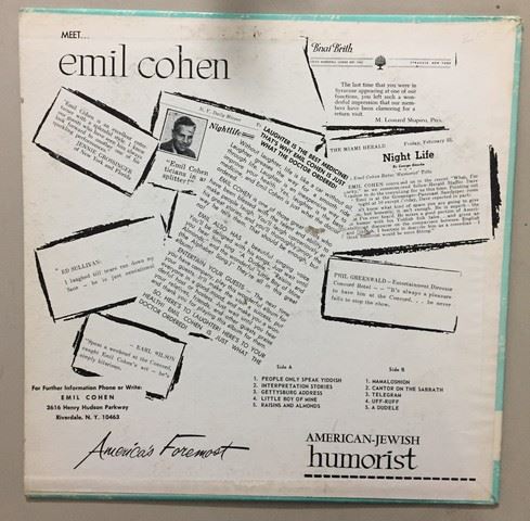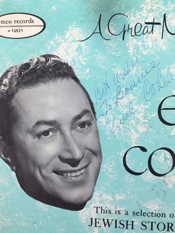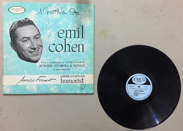 American- Jewish humorist Emil Cohen "A Great New Star" (1958) live recording vinyl record, autographed by Emil Cohen on the album cover, record includes10 Jewish songs and stories between the 2 sides, songs include, "Raisins and Almonds"; "People only speak Yiddish"; "Telegram", etc., album cover is light blue with Emil Cohen's face and white Jewish star.
