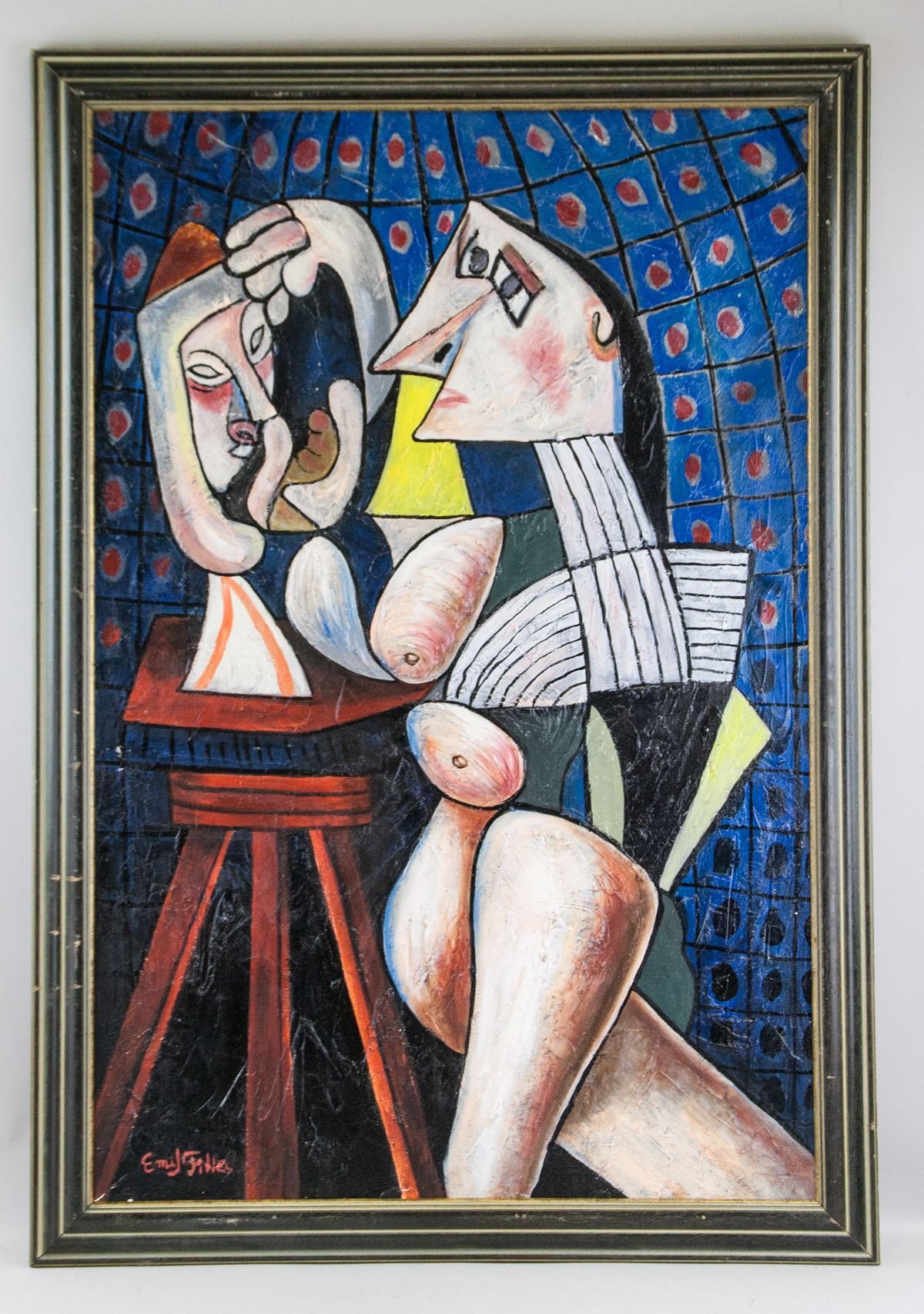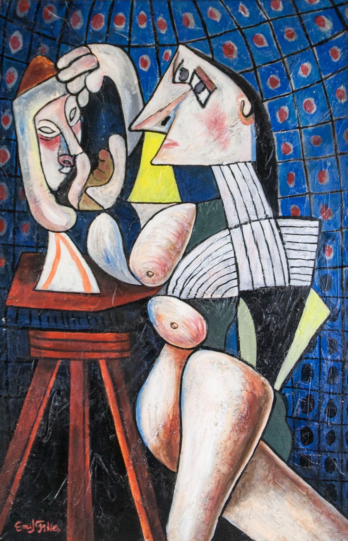 Oil on canvas, framed. Featuring a cubist portrait and mirror. Signed Emil Filla on the lower left corner. One label affixed to verso of the upper left corner inscribed FROM THE GALLERIES OF ASSOCIATED AMERICAN ARTISTS 711 FIFTH AVENUE NEW YORK with red wax seal. Stamped on canvas of verso C^2 02588. Attributed to Emil Filla (1882-1953, Czech). 90.5 x 60 cm (35.6 x 23.6 inches). Framed size: 100 x 69.5 cm (39.4 x 27.4 inches). PROVENANCE: Southern Ontarioe state