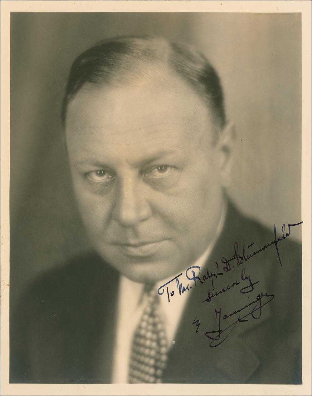 Vintage sepia matte-finish 8 x 10 photo, signed and inscribed in fountain pen “To Mr. Ralph D. Blummerfield, Sincerely, E. Jannings.” In fine condition, with a trivial spot of silvering.