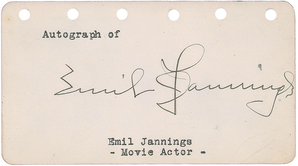 Swiss actor (1884–1950) and the first winner of the Academy Award for Best Actor. With the advent of sound films, his thick accent ended his career. He returned to Europe and became an enthusiastic supporter of the Nazis, starring in several propagandistic films. Vintage fountain pen signature, “Emil Jannings,” on an off-white 4.5 x 2.5 page. In fine condition.