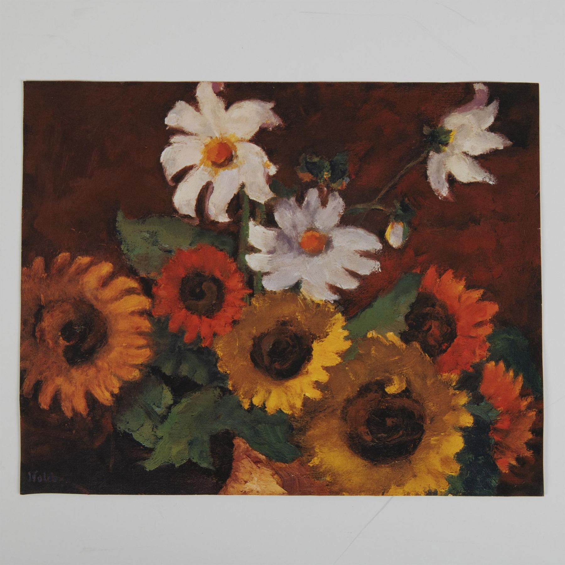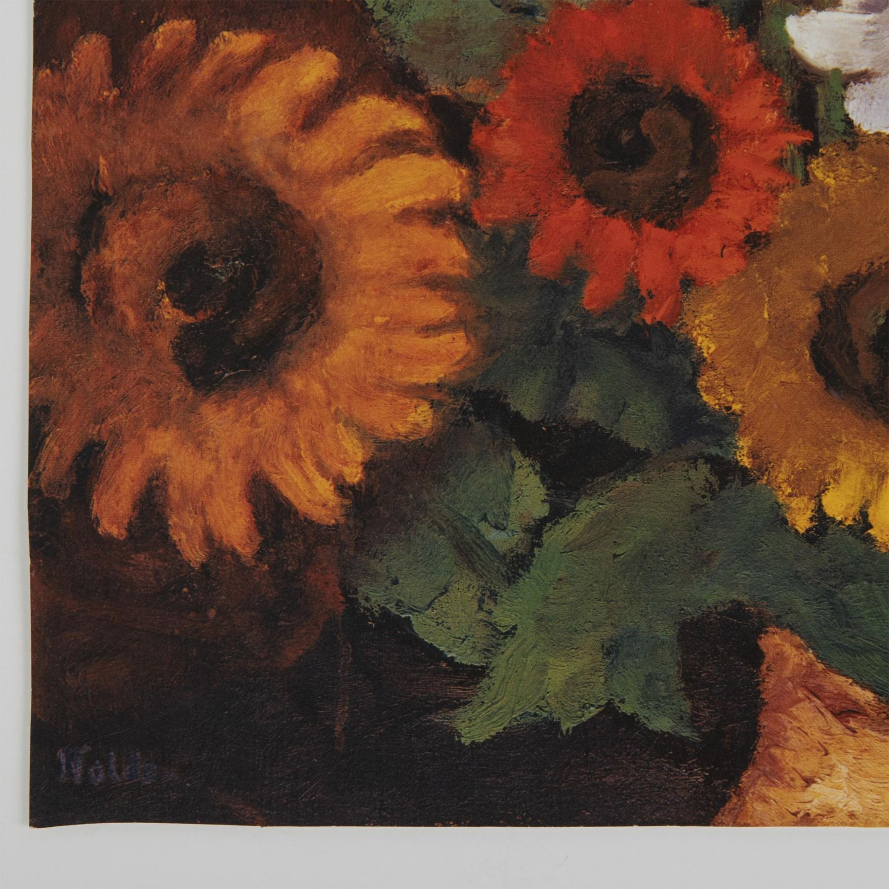 An color offset lithograph on paper after Emil Nolde's original 1941 painting titled Sonnenblumen und weisse Dahlien (Sunflowers and White Dahlias). Signature on lower left.