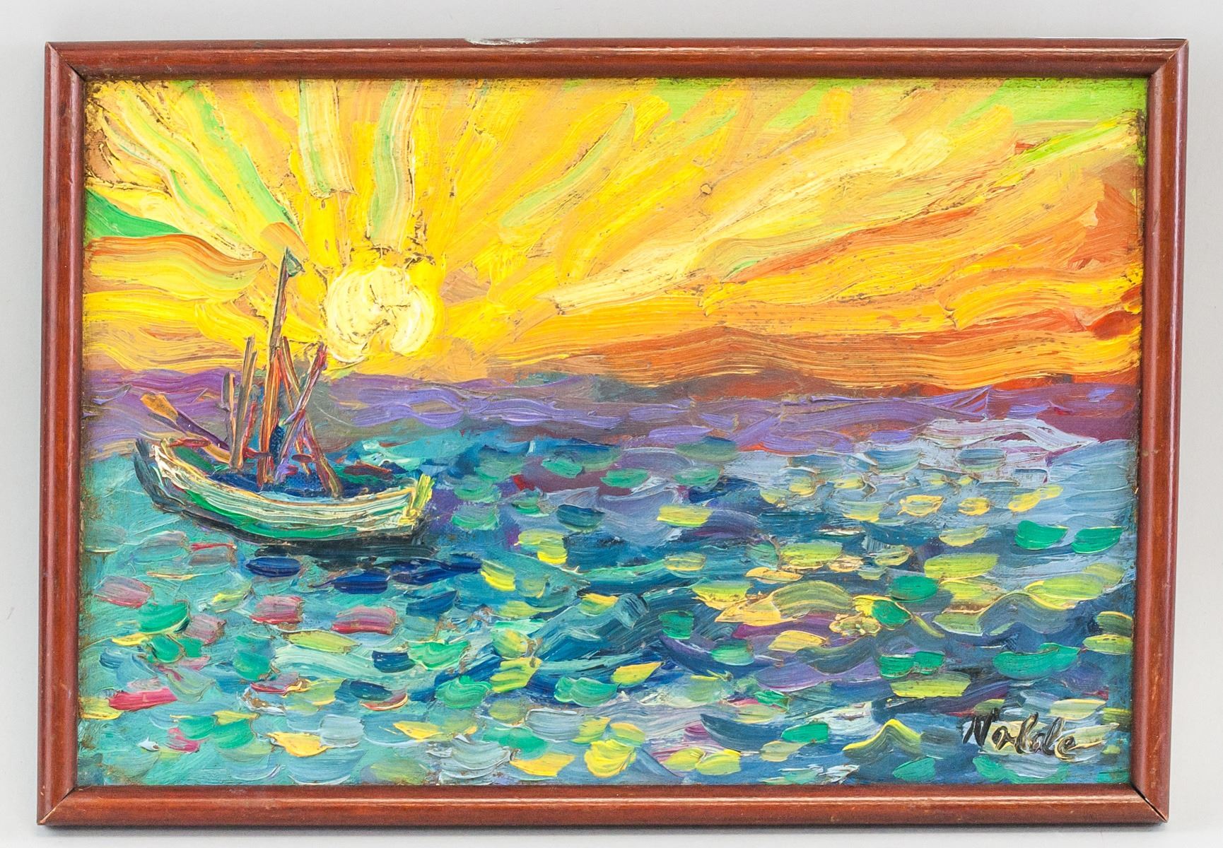 Oil on board, framed. Featuring impressionist landscape of sailboat on the ocean with a setting sun. Signed "Nolde" in the bottom right corner. Attributed to Emil Nolde (1867-1956, German-Danish). Board size: 21 x 31 cm (8.25 x 12.25 inches). Frame size: 23.5 x 34 cm (9.25 x 13.25 inches).