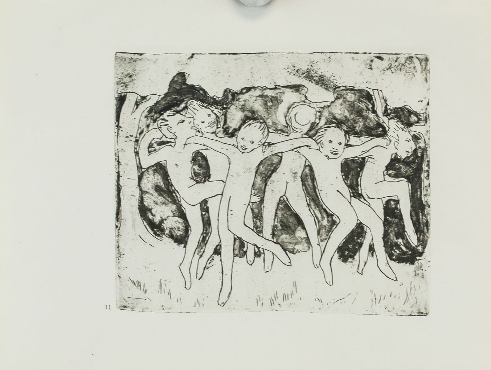 Etching print on paper. Featuring dancing wood sprites in a circle with their arms around each other's backs. "11" printed near the bottom left corner. Attributed to Emil Nolde (1867-1956, German-Danish). 22 x 28 cm (8.5 x 11 in). PROVENANCE: This lot carries limited provenance from an American estate (St. Louis)
