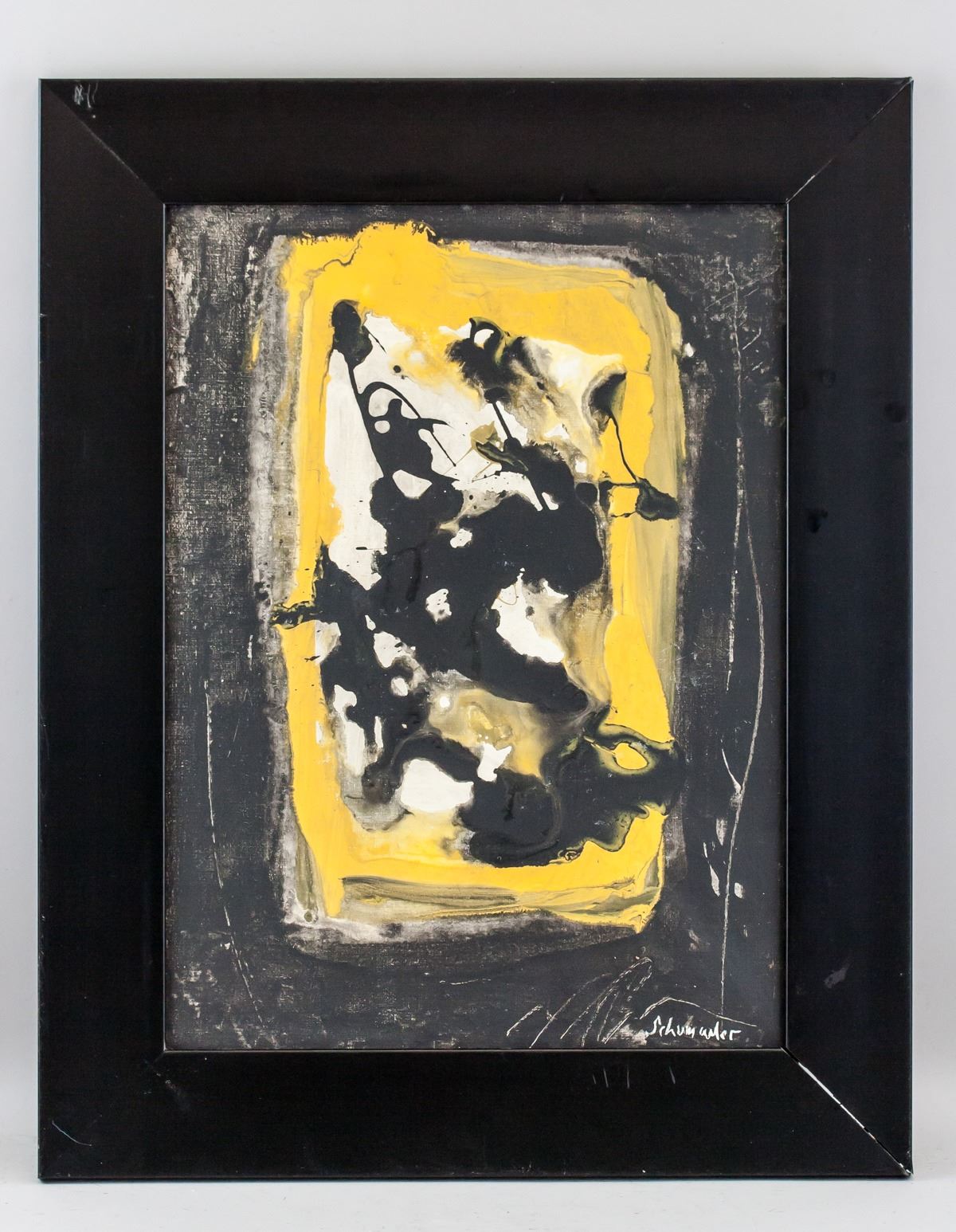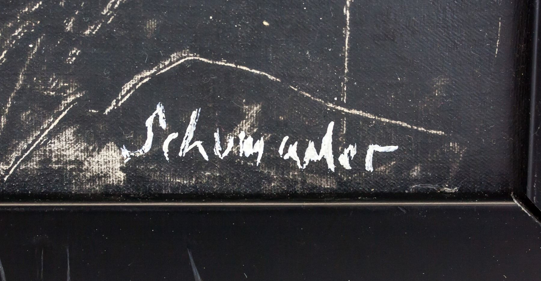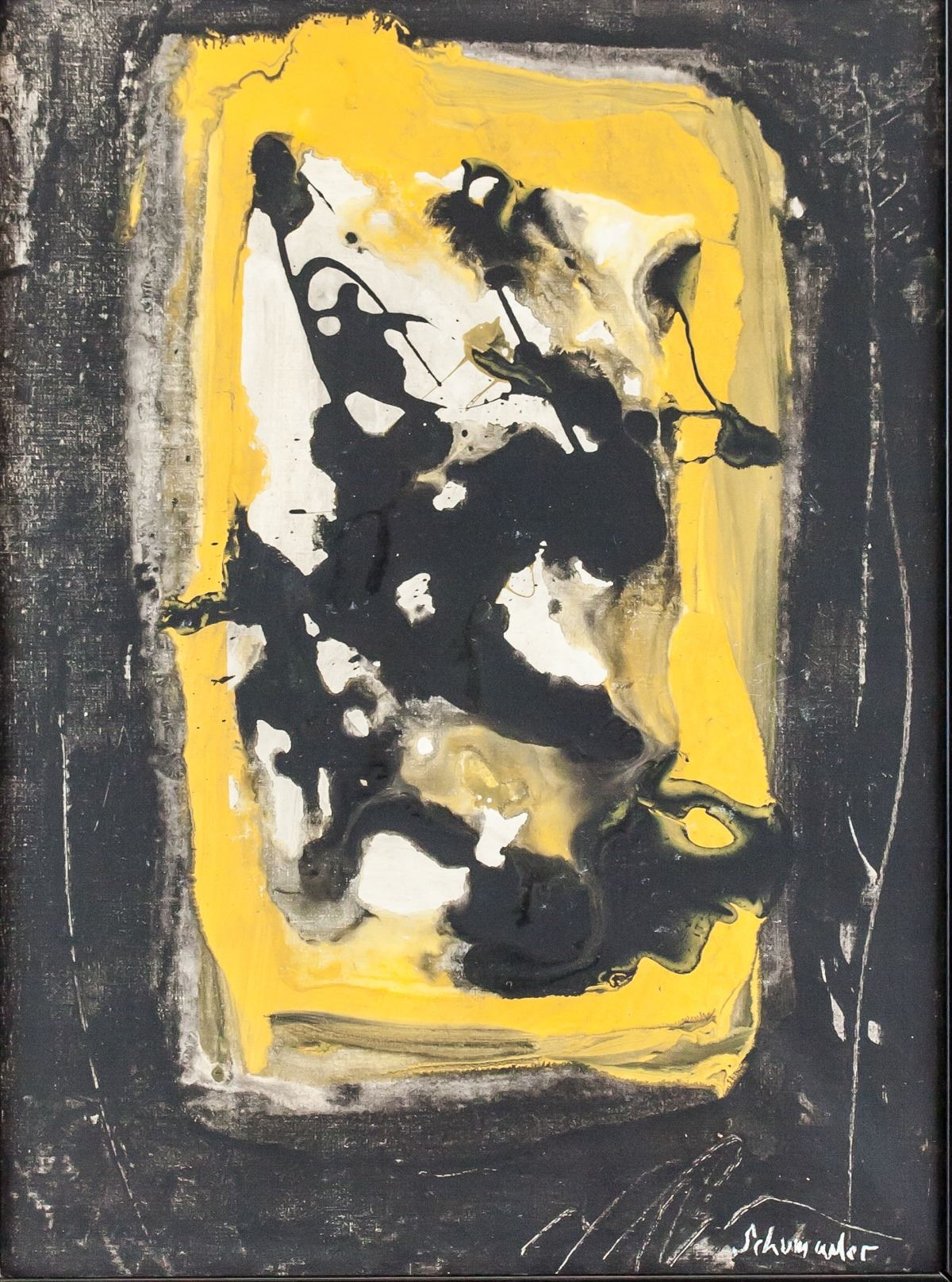 Oil on canvas, framed. Featuring an abstract expressionist composition. Signed Schumacher in lower right hand corner. Attributed to Emil Schumacher (1912-1999, German). 50 x 38 cm (20 x 14.75 in), Frame: 64 x 57 cm (25.25 x 20 in). PROVENANCE: Southern Ontario estate