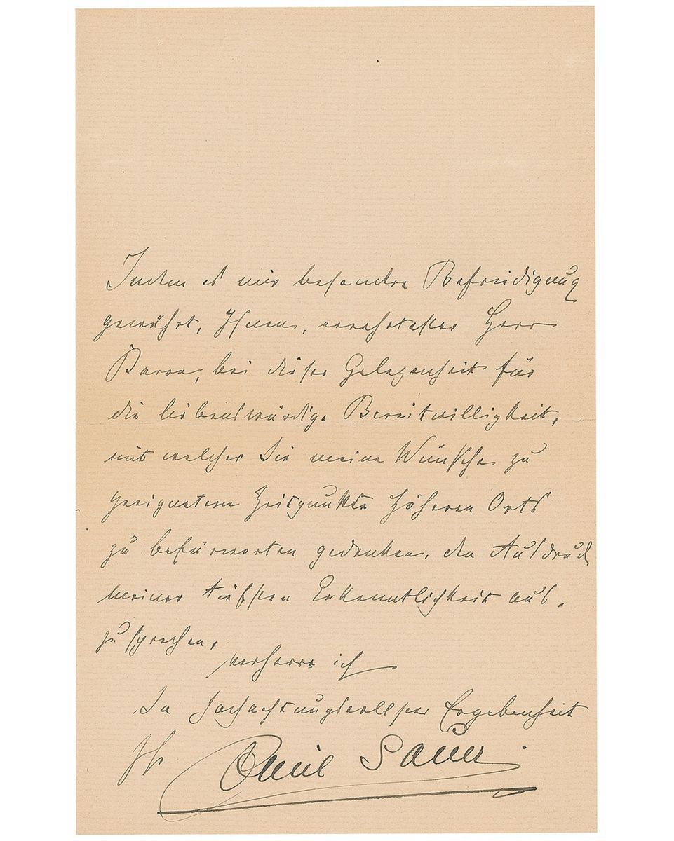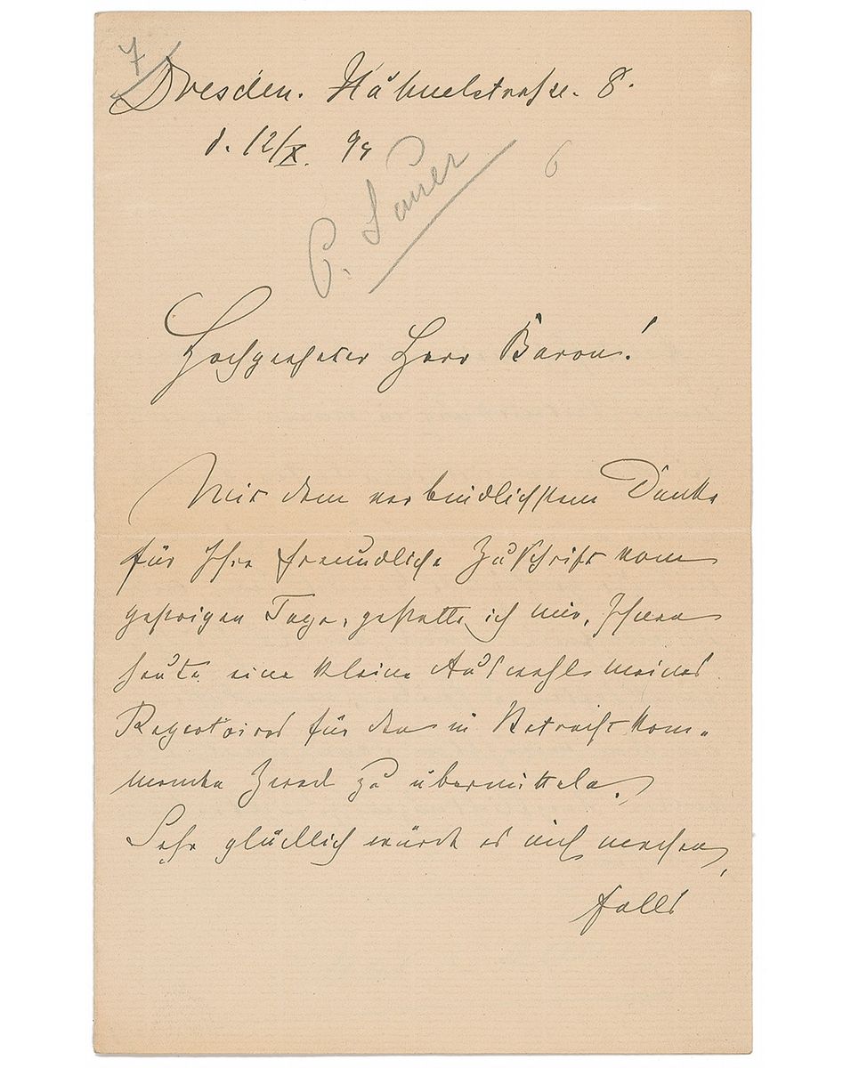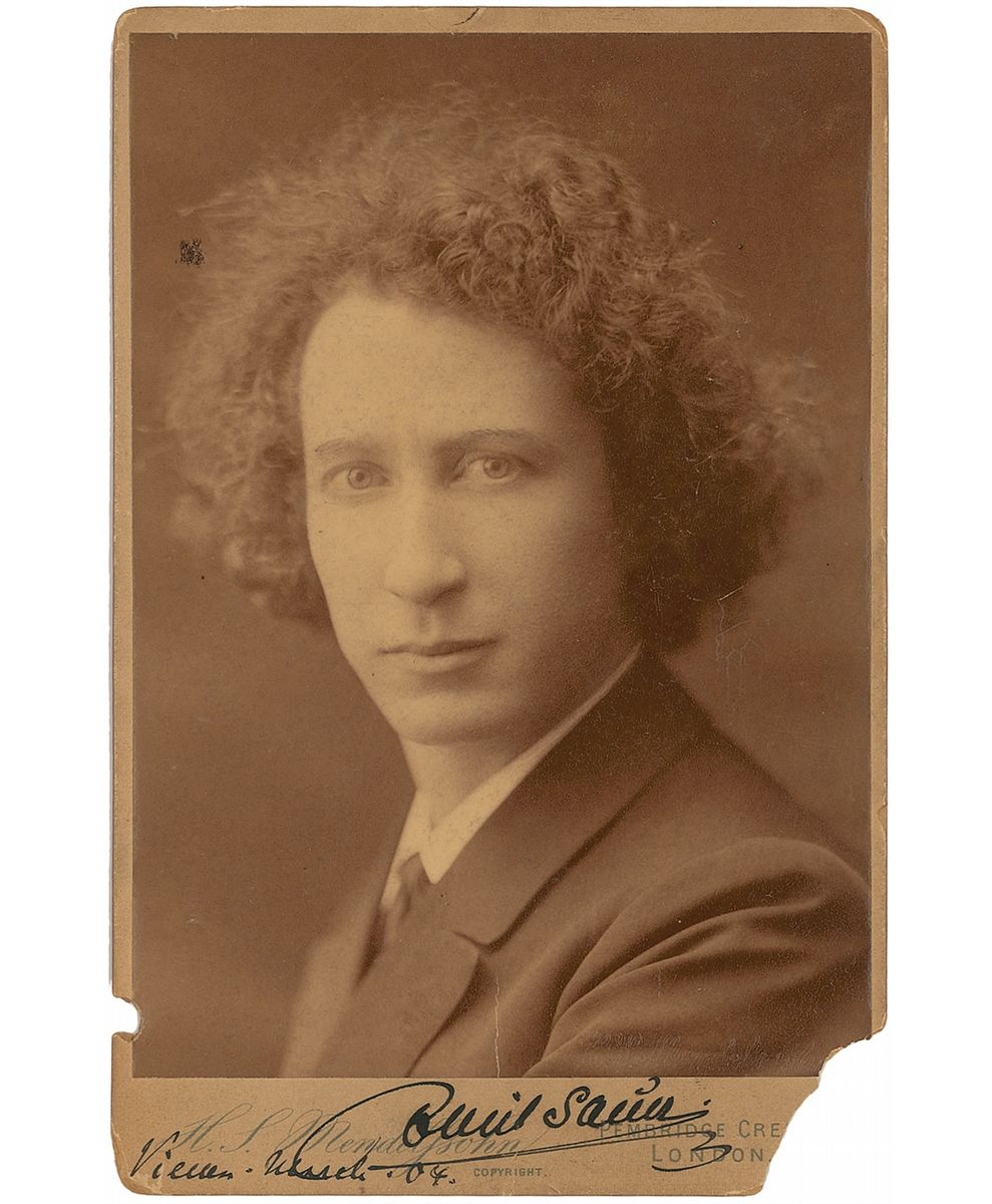 German composer, pianist, and music teacher (1862–1942) who was one of Franz Liszt’s pupils, considered one of the most distinguished pianists of his generation. Two items: uncommon 4.25 x 6.5 cabinet photo of von Sauer by H. S. Mendelssohn of London, signed on the mount in black ink and dated March 1904; and an untranslated LS in German, signed “Emil Sauer,” three pages on two adjoining sheets, 5 x 7.75, October 12, 1894. Significant chipping to lower corners of the cabinet photo, otherwise overall fine condition. Originates from the collection of American violinist and pianist Louis Persinger (1887–1966), who trained at the Leipzig Conservatory and later taught at Juilliard, mentoring the likes of Yehudi Menuhin, Ruggiero Ricci, and Isaac Stern.