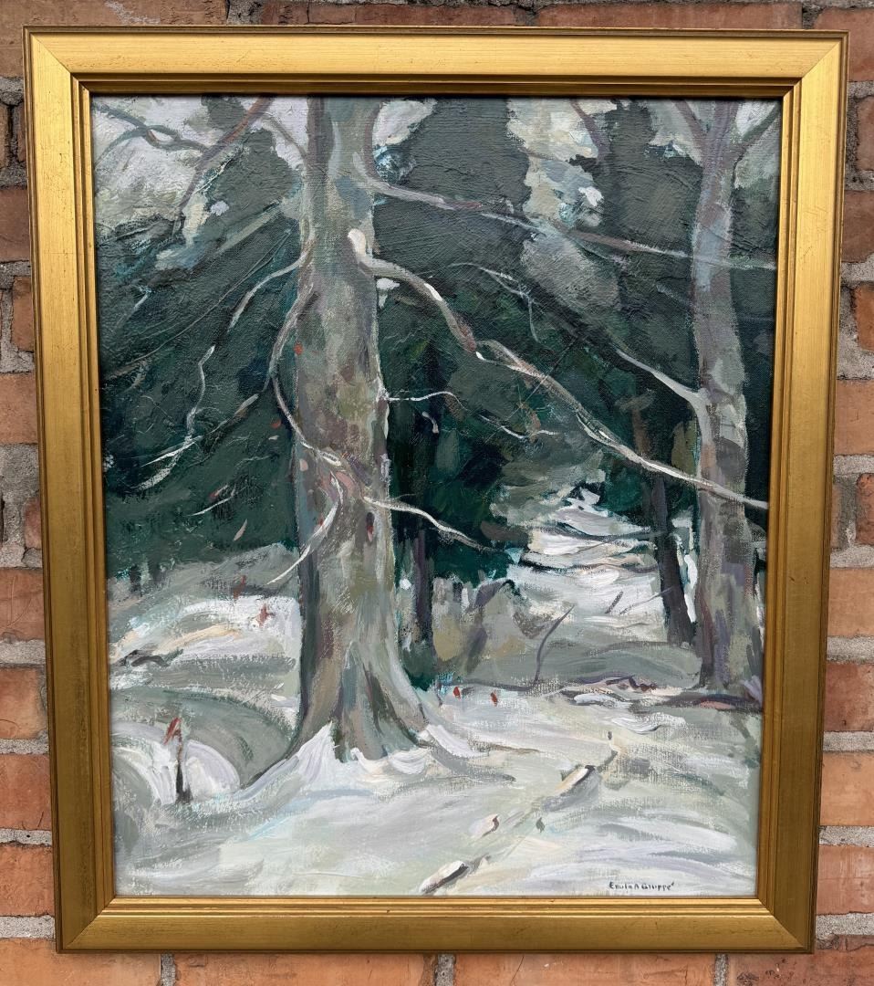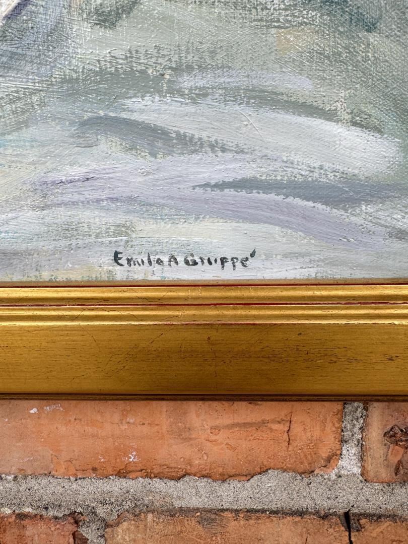 Oil on Canvas. Title is The Hunters Path. 20" by 24" unframed. 23" by 27" framed. Emile Albert Gruppe (1896 - 1978) was active/lived in Massachusetts. Emile Gruppe is known for Landscape and marine painting, teaching. Born in Rochester, New York, Emile Gruppe became a renowned New England landscape and marine painter. Although he is best known for his variety of Impressionistic landscapes, he also painted figures and portraits. His modern style was largely inherited from French Impressionist Claude Monet. "Lily Pads," date and location unknown, one of Gruppes landscapes, attests to Monets influence and is similar to some of the paintings in Monets "Water Lily" series. He was the son of landscape artist Charles Paul Gruppe, and was born in 1896 in Rochester, New York. He had a very strong art background. In addition to being raised by an artistic father, he was also educated in art at The Hague in the Netherlands and in New York City at the National Academy of Design and The Arts Students League. He also received instruction from artists George Bridgeman, Charles Chapman, Richard Miller and John F. Carlson, with whom he would later founded, in 1942, the Gruppe Summer School in Gloucester, Massachusetts. He made his permanent studio in Gloucester. His artistic career had begun in 1915, but was briefly interrupted in 1917 when he spent a year in the United States Navy. Gruppes prolific career brought him many awards and memberships. His popular painting "Winter, Vermont," date and location unknown, won the Richard Mitton Award at the Jordan Marsh Exhibition in Boston in 1843.