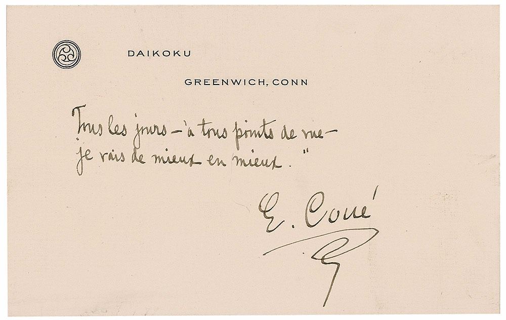French psychologist and pharmacist (1857–1926) who introduced a method of self-improvement based on optimistic autosuggestion. AQS, signed “E. Coue,” on an off-white 5.25 x 3.25 card, embossed with “Daikoku, Greenwich, Conn.” Coue pens the original French of his classic positive thinking mantra, (translated): “Every day, in every way, I am getting better and better.” In fine condition, with a bit of scattered light soiling.