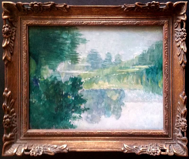 "Riverscape" An Impressionistic painting of a river and surrounding woods and grasses. There is a massive tree reflected in the water on the right. Oil on woodboard, it is dated "Aout 1951". Measures 10 3/4 x 13 3/4 inches not including the frame. Please note that this is the original frame. Accompanied by a Certificate of Authenticity. Emile Victor Auguste Delobre has risen in stature among the names of the French Impressionist movement over the last two decades. Delobre was born in Paris in 1873 and the facts of his life speak of a young man whose enchantment with art began at an early age.