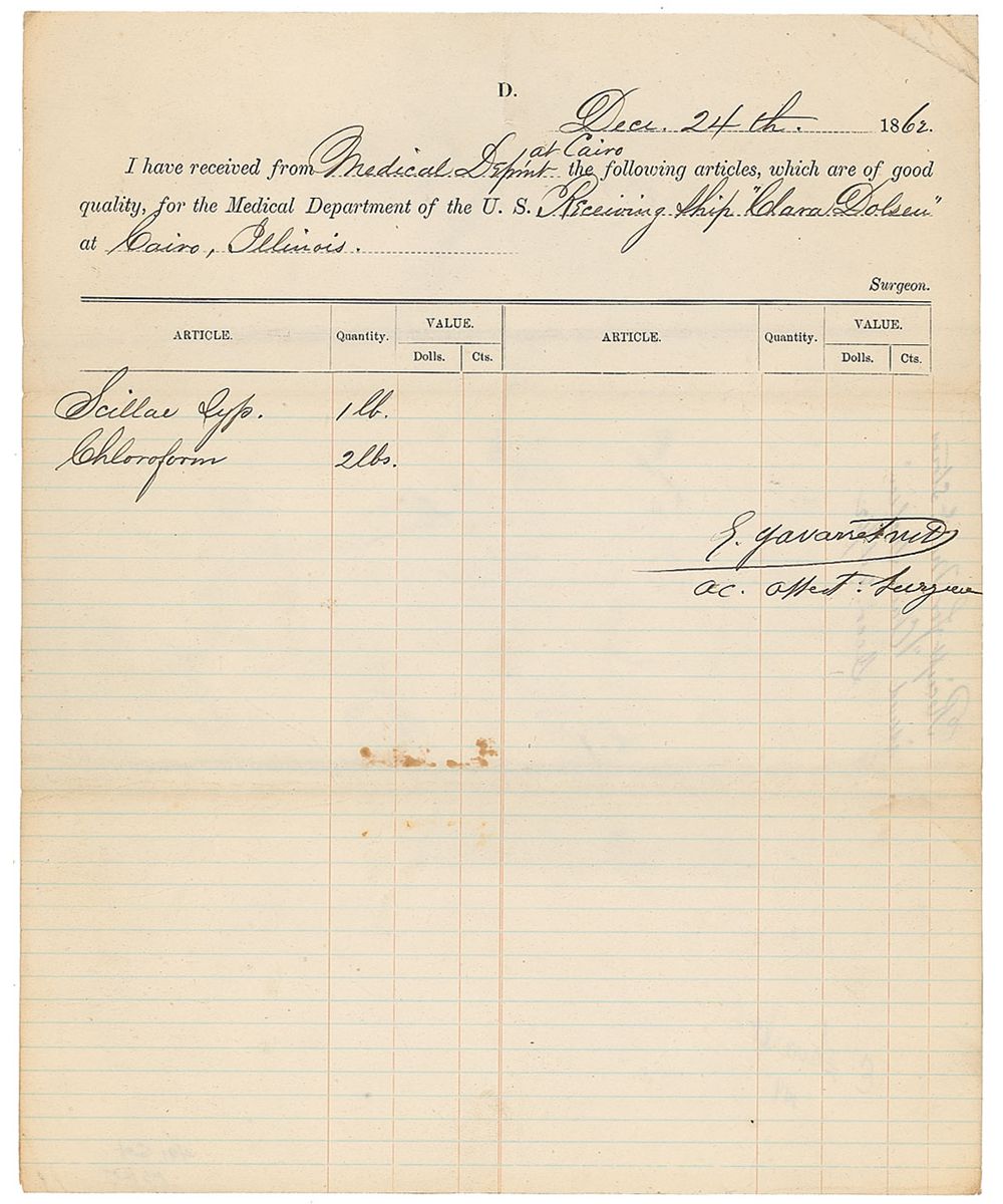 Surgeon in the Union Navy. Civil War–dated partly-printed DS, signed “E. Gavarret, M. D., Ac. Assist. Surgeon,” one page, 8 x 10, December 24, 1862. Gavarret confirms receipt of one pound of “Scillae” and two pounds of “Chloroform” upon the “ship ‘Clara Dolson’ at Cairo, Illinois.” Two horizontal storage folds, a small area of staining to the lower portion, and expected document wear, otherwise fine condition.