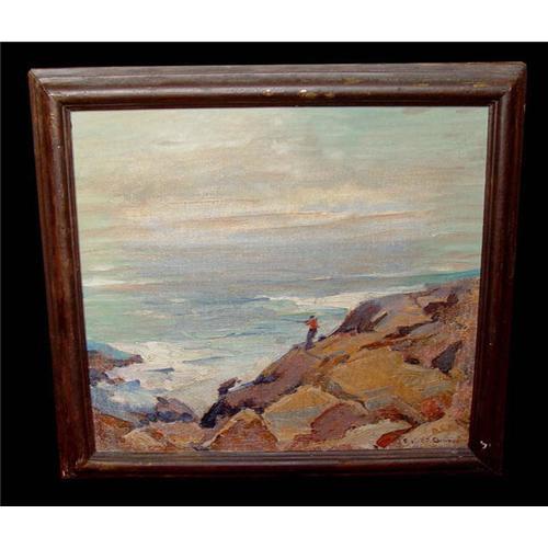 Signed Emile A. Gruppe lower right, and bears the thick impressionistic brush stoke typical to his style. Depicting a fisherman standing at the edge of the rocky coast. Original stretcher and frame. ****NOTE: Email for larger images.