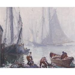Emile Gruppe (American, 1896-1978), “Gloucester Fog”, c. 1960; oil/canvas, 30” x 36”, signed; titled verso. Important New England impressionist, well known for his harbor scenes and landscapes. Gruppe studied with John Carlson and Richard Miller. He exhibited from the 1910s-50s, at the National Academy of Design, Art Institute of Chicago, Salmagundi Club, North Shore Art Association, Rockport Art Association, New Haven Paint and Clay Club, and the Connecticut Academy of Fine Arts. His work is in numerous important public collections. Gruppe was clearly one of the most central figures to the Cape Ann artist colony, and his work is an icon of American impressionism executed in New England in the early 20th century. This is a large and important example of the artist’s work.