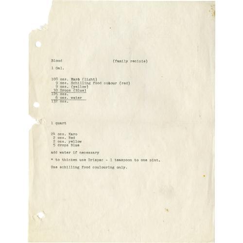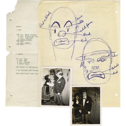 <B>Emile LaVigne Blood Recipe and Clown Drawing.</B></I> From the notes and documents of make-up artist Emile LaVigne comes this typed page titled "Blood (family recipe)" and a page featuring two sketches of clown faces with make-up notes written by LaVigne on the back of a page from the script for <I>Fun with Dick and Jane</B></I> (1977), accompanied by two b&w costume snapshots. In overall Fine to Very Fine condition with tearing along one edge of the recipe, moderate overall tanning to the sketch, punch holes to both pages, and heavy wear to the photos.<I>From the estate of Emile LaVigne.</B></I><BR><BR><b>Shipping:</b> Flat Material, Small (<a target="_blank" href="http://www.heritageauctions.com/common/shipping.php">view shipping information</a>)
