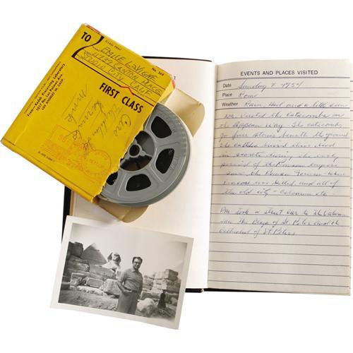 <B>Emile LaVigne Diary, 8mm Film, and Photo from "Land of the Pharoahs" Production.</B></I> "Her Blood Stained Every Stone of the Pyramid!" was promotional tag for <I>Land of the Pharoahs,</B></I> the Howard Hawks historical drama that starred Joan Collins and Jack Hawkins. This small journal was kept by LaVigne while he worked on location in Italy and Egypt on this film. It only contains one brief entry, made in Rome and dated Sunday the 7th, 1954, along with handwritten bank account and hotel reservation notes and souvenir stamps. Also included is a b&w 3.5" x 2.5" photo of LaVigne visiting the Sphinx and a reel of 8mm footage shot by him in Egypt. All items are in Excellent condition.<I>From the estate of Emile LaVigne.</B></I><BR><BR><b>Shipping:</b> Books & Catalogs (<a target="_blank" href="http://www.heritageauctions.com/common/shipping.php">view shipping information</a>)