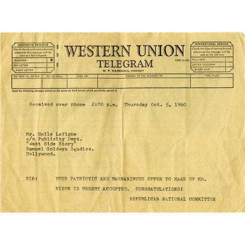 <B>Historic Emile LaVigne Telegram from Richard Nixon.</B></I> In the first of four historic televised debates during the 1960 presidential campaign, John F. Kennedy not only looked better physically, he also came off as polished, articulate, and mature, giving a performance that dispelled many people's worries that the young senator was too inexperienced to be president. His opponent, Richard Nixon, was recovering from an illness, wore ill-fitting clothes, and sported a visible five o'clock shadow. It was an appearance that said a lot in the still-young medium of television, though people listening on the radio felt the debates were a draw, and set the tone for televised political debates to this day. This Western Union telegram, dated October 5, 1960, was sent to make-up artist Emile LaVigne from the Republican National Committee between the first and second debates. It reads: "Sir: your patriotic and magnanimous offer to make up Mr. Nixon is hereby accepted. Congratulations!". Unfortunately, it would be too little, too late, as Nixon ultimately lost the election by a narrow margin, and would have to wait eight more years to make it to the White House. A curious piece of Americana, the telegram is in Very Fine to Excellent condition with mild wear and tanning and some light fold creases. <I>From the estate of Emile LaVigne.</B></I><BR><BR><b>Shipping:</b> Small Flat (<a target="_blank" href="http://www.heritageauctions.com/common/shipping.php">view shipping information</a>)