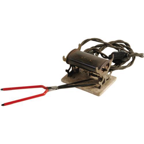 <B>Emile LaVigne Heater with Iron.</B></I> A small electric tool heater with curling irons from the workshop of make-up and effects artist Emile LaVigne, both with his name etched on them in small lettering. The irons are in Excellent condition, and the heater is in Fine to Very Fine condition with some appreciable fraying around the wire sheathing at the connection points.<I>From the estate of Emile LaVigne.</B></I><BR><BR><b>Shipping:</b> Other (TBD) (<a target="_blank" href="http://www.heritageauctions.com/common/shipping.php">view shipping information</a>)