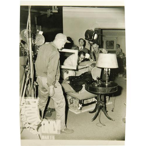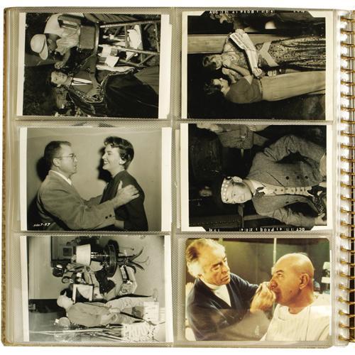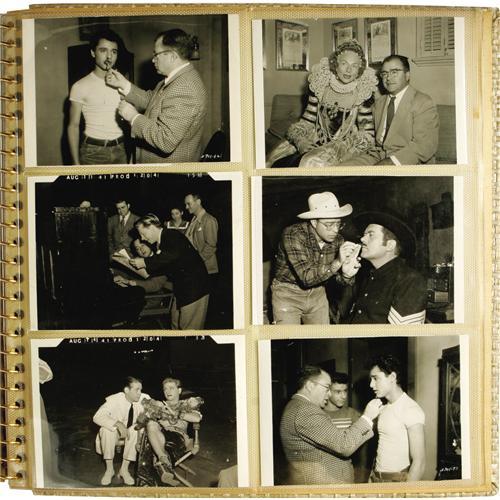 <B>Emile LaVigne Photo Scrapbook For Various Films.</B></I> A 12" x 12" photo album totaling 16 pages and more than 100 b&w and color snapshots of make-up artist Emile LaVigne at work on various productions, including <I>Land of the Pharaohs,</B></I> <I>Lincoln,</B></I> <I>Invitation to a Gunfighter,</B></I> <I>The Story of Mankind,</B></I> and many others. In overall Excellent condition.<I>From the estate of Emile LaVigne.</B></I><BR><BR><b>Shipping:</b> Books & Catalogs (<a target="_blank" href="http://www.heritageauctions.com/common/shipping.php">view shipping information</a>)