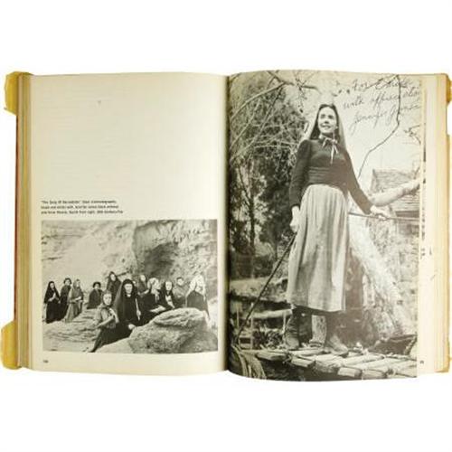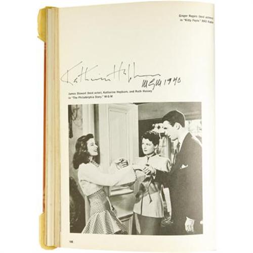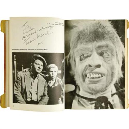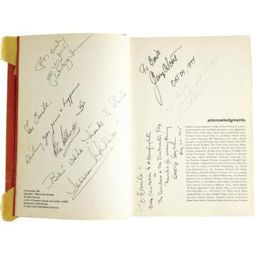 <B>Emile LaVigne's Signed Academy Awards Book.</B></I> Hollywood make-up artist Emile LaVigne took his copy of the 1964 book <I>The Academy Awards: A Pictorial History</B></I> and secured within it the personally inscribed autographs of a magnificent array of Oscar winners: John Wayne, Katherine Hepburn (twice), Fredric March (twice), Bette Davis, Henry Fonda, Jennifer Jones, Ray Milland, Gregory Peck (twice), Jason Robards, William Holden (twice), Charlton Heston, Eva Marie Saint, Ernest Borgnine, Jack Lemmon (twice, both times signed "Jack"), David Niven (three times), Yul Brynner, Ingrid Bergman, Joanne Woodward, Alec Guinness, Max von Sydow, Maximilian Schell, Paul Newman, Anne Bancroft, Elizabeth Taylor, Maggie Smith, Art Carney, Cloris Leachman, Gig Young, Fred Astaire, Dustin Hoffman, Goldie Hawn and George C. Scott. The book also bears the signatures of such stars as Richard Burton (who had signed with Taylor), Natalie Wood (twice), Peter Sellers, Charles Bronson, Sally Kellerman, Gilbert Roland, Jane Wyatt, Robert Young, Lauren Bacall, Richard Chamberlain, Will Geer, Douglas Fairbanks, Jr., Roddy McDowall, and Peter Cushing. In some cases the star has signed on a picture of his/her Oscar-winning performance (e.g., Bette Davis on a portrait from <I>Jezebel,</B></I> Jennifer Jones on a picture from <I>The Song of Bernadette,</B></I> etc.); in most cases, they signed near their picture, while many of the post-1964 signed the title page and inside cover pages. The 7.5" x 10" hardbound book has no dust jacket and has some cover staining, but is solidly bound, with the inside pages clean. LaVigne had added his name and address on the inside front cover and has enclosed in the back a <I>Los Angeles Times</B></I> obituary for fellow make-up man Frank Westmore. This is a unique and stunning array of major Hollywood Star autographs, in a compact and very desirable form, from the estate of a man who worked intimately with most of the "greats." Very Fine condition. <I>From the estate of Emile LaVigne</B></I>. <I>Accompanied by LOA from PSA/DNA.</B></I><BR><BR><b>Shipping:</b> Books & Catalogs (<a target="_blank" href="http://www.heritageauctions.com/common/shipping.php">view shipping information</a>)