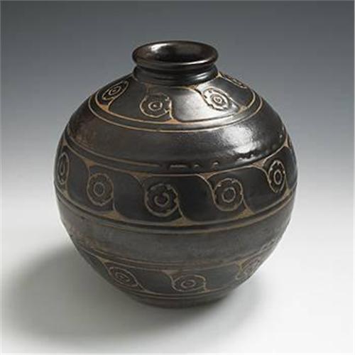 Emile Lenoble vase France, c. 1925 glazed and carved stoneware 9.25 dia x 9.5 h inches Signed with impressed artist's cipher to underside. Provenance: Robert Frommer, New York Private collection, Chicago