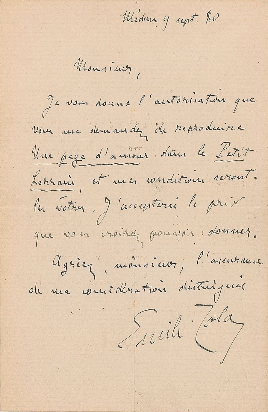 ALS in French, one page, 5.25 x 8, September 9, 1880. Letter written from Médan, in full (translated): "I give you the authorization which you request of me to reproduce 'Une page d'amour' in the 'Little Lorraine' and my conditions agree with yours. I shall accept the sum which you are able to pay. Receive, Monsieur, the assurance of my distinguished regard." In fine condition. Une page d'amour, the eighth novel in Zola's Rougon-Macquart series, was first serialized between December 11, 1877, and April 4, 1878, in Le Bien public, before being published in novel form by Charpentier in April 1878. Set among the petite bourgeoisie in Second Empire suburban Paris, the work has seen four film adaptations and has been translated several times, with various iterations of the title: Hélène: A Love Episode, A Love Episode, A Page of Love, A Love Affair, and A Love Story.