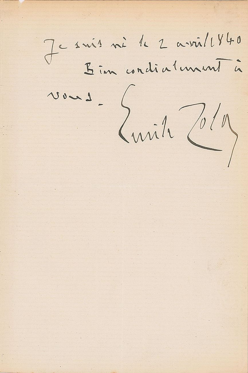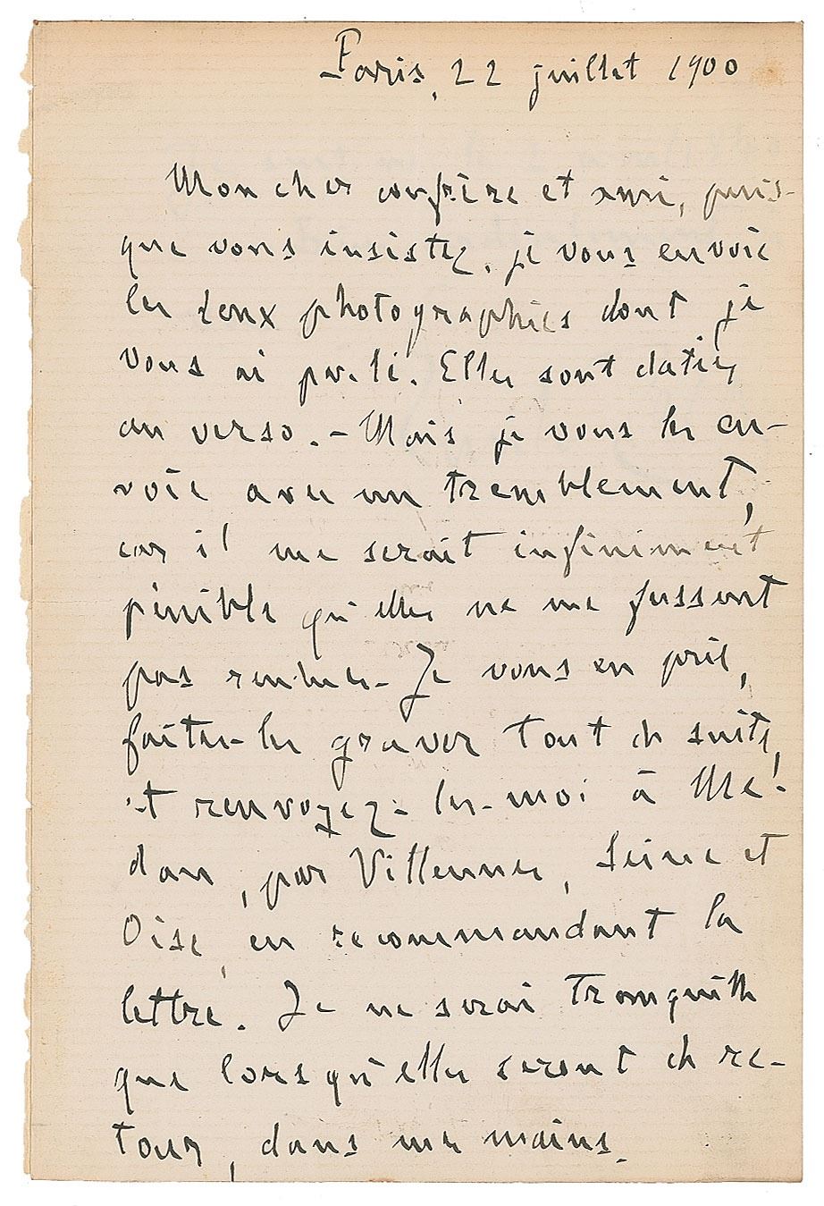 ALS in French, two pages on two adjoining sheets, 5.25 x 7.75, July 22, 1900. Written from Paris, a letter to a friend and colleague, in full (translated): "Since you are so insistent, I am sending you the two photographs which I spoke to you about. They are dated on the back. But I am sending them to you with much trepidation, because I would be infinitely distressed if they were not returned. I beg you, have engravings made of them immediately, and return them to me at Medan, par Villenes, Seine et Oise, by registered mail. I shall not be happy until they are once again safe in my hands. I was born April 2, 1840." In fine condition, with a thin mounting strip along the back edge of the second page.