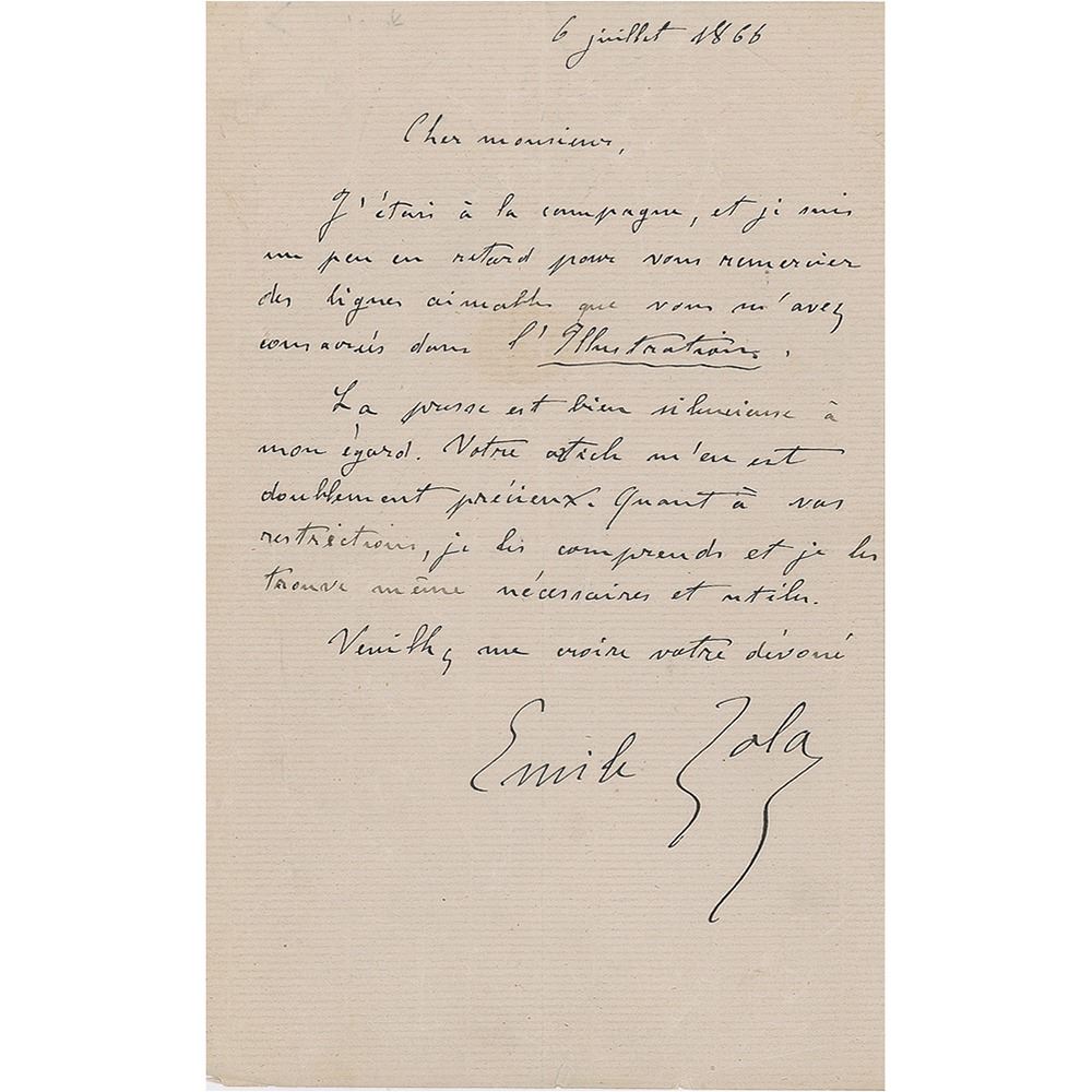 ALS in French, one page, 5.25 x 8.25, July 6, 1866. In full (translated): "I was out in the countryside and a bit late in thanking you for the kind words you devoted to me in The Illustration. The press has been quite mute with regard to me, so I find your article doubly precious. As for your restrictions, I understand them and consider them even necessary and useful." In very good to fine condition, with overall creasing. Founded by Édouard Charton, L'Illustration was a weekly French newspaper published in Paris from 1843 to 1944. In 1891, L'Illustration became the first French newspaper to publish a photograph, and in 1907 was the first to publish a color photograph.