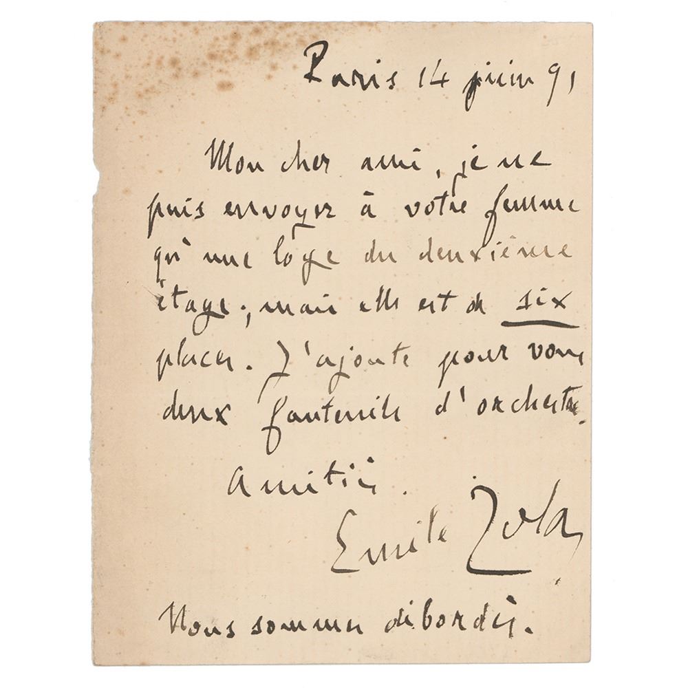 Untranslated ALS in French, 4 x 5.25, June 14, 1891. Written from Paris, a letter to an unnamed friend concerning tickets to an orchestral concert. In very good to fine condition, with spotty staining to the upper left corner.