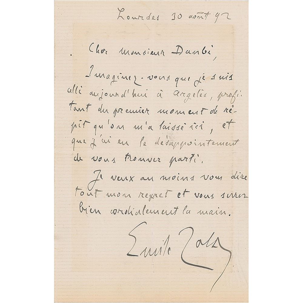 ALS in French, one page, 5.25 x 8, August 30, 1892. Untranslated letter written from Lourdes. In fine condition, with a block of light toning. Published in 1894, Lourdes was the title of the first novel in Zola’s Les Trois Villes (The Three Cities) trilogy.