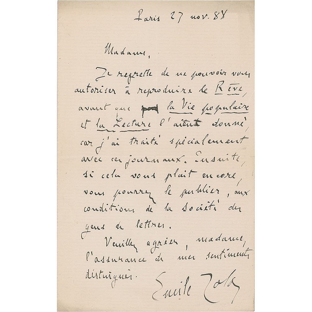 ALS in French, one page, 5 x 8, November 27, 1888. Written from Paris, an untranslated letter regarding the reproduction of Zola's novel Le Rêve in the periodicals La Vie populaire and La Lecture. In fine condition. Founded in 1880, La Vie populaire was a French illustrated biweekly periodical that featured serialized novels and short stories, as well as numerous illustrations. In 1889, Zola's novel, The Human Beast appeared there in several installments. Published by Charpentier in October 1888, Le rêve (The Dream), the sixteenth novel in Zola's Rougon-Macquart series, is about an orphan girl who falls in love with a nobleman during the 1860s.