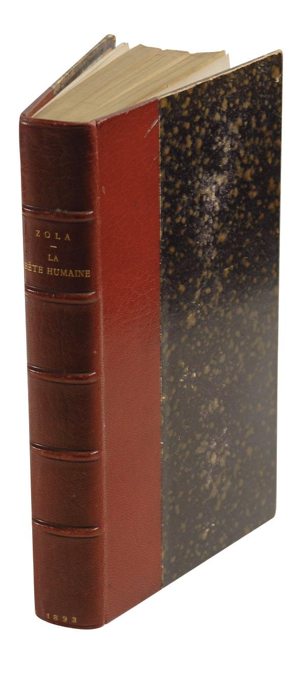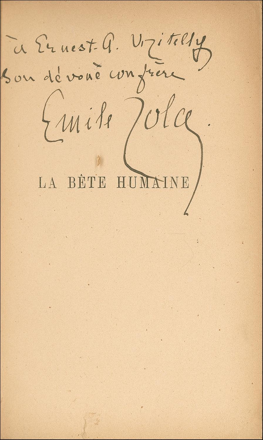 Signed book: La Bete Humaine. First edition. Paris: Bibliothèque Charpentier, 1893. Softcover rebound in hardcover, 5.75 x 7.5, 415 pages. Signed and inscribed on the half-title page, in French (translated): “To Ernest A. Vizitelly, from his devoted friend Emile Zola.” Uniform toning to signed page, as well as all other pages, small tear to bottom of signed page and a few other opening pages, owner’s signature, scattered creasing, soiling, and edge wear to original front cover, and soiling to original back cover, otherwise very good condition. New boards and spine show scattered wear, rubbing, and corner bumps.