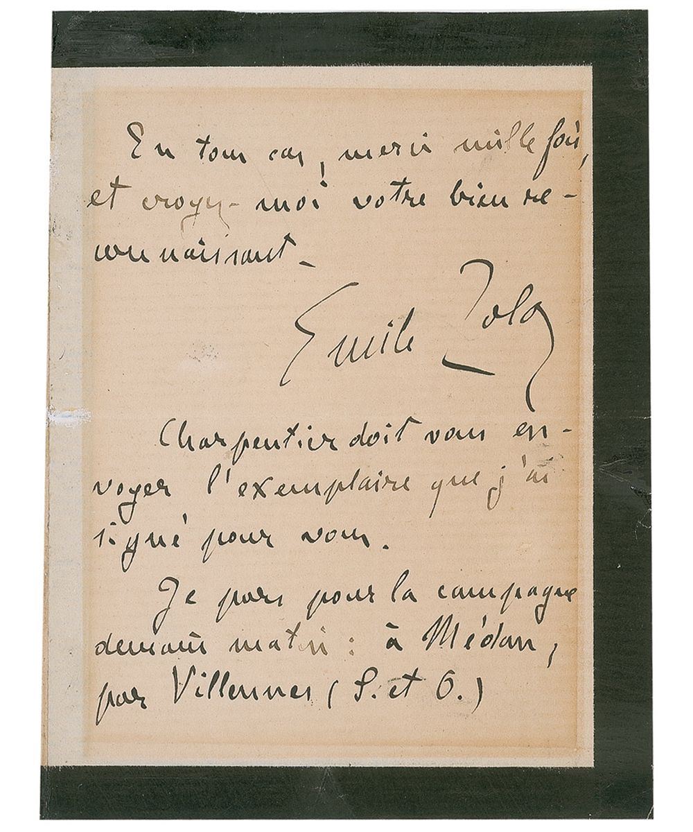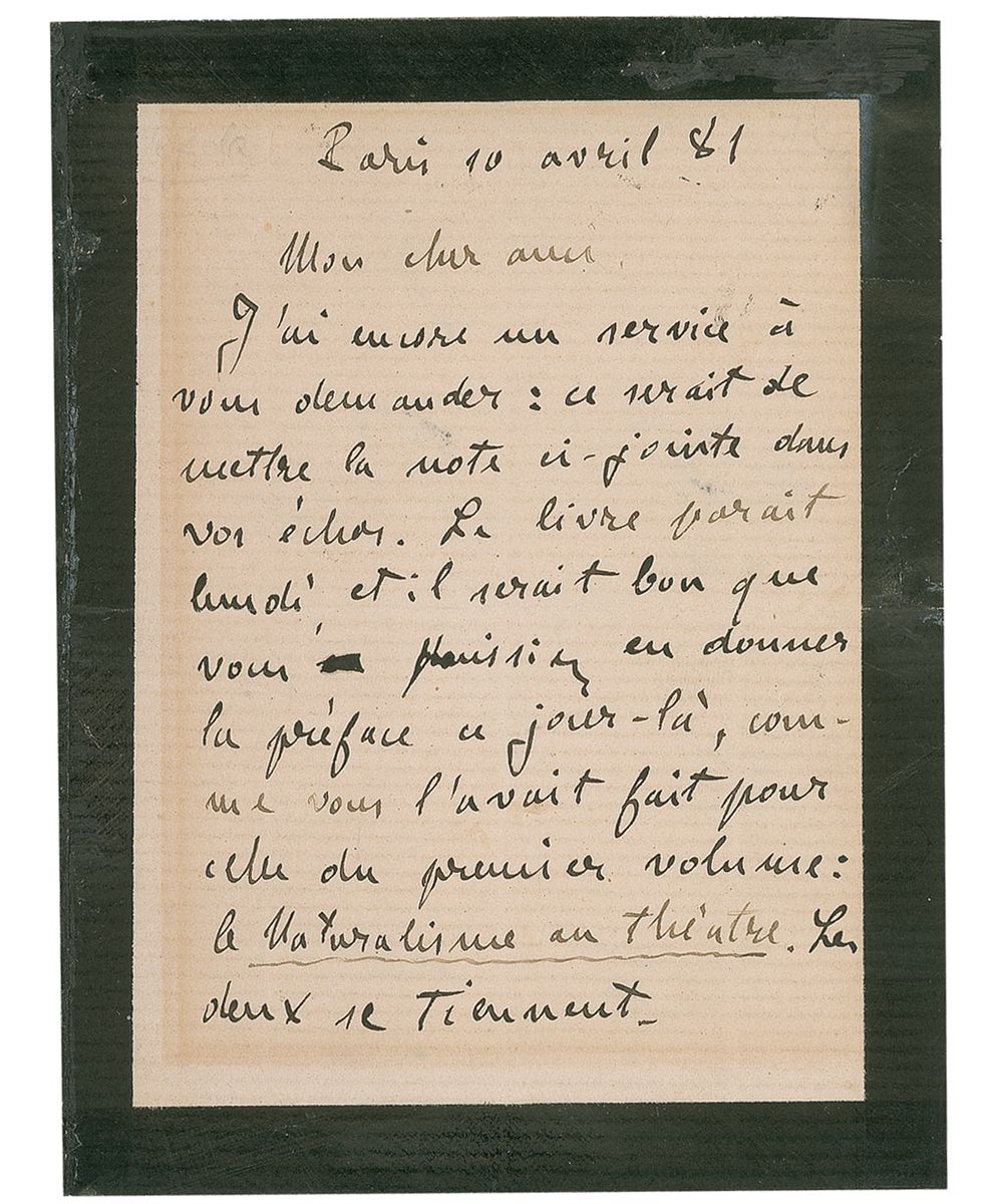 ALS in French, two pages on two adjoining sheets, 4 x 5.25, black-bordered stationery letterhead, April 10, 1881. Letter to a “dear friend.” In part (translated): “I have another service to ask of you: please insert the enclosed note in your ‘Echos.’ The book will appear on Monday and it would be a good idea for you to give the preface that day as you did for the preface of the first volume of ‘Naturalism in the Theater. The two are inter-connected.” Zola also adds a brief postscript, “Charpentier will send you the copy that I signed for you.” Uniform blocks of toning over both pages of text and signature, scattered creases, and mounting remnant affixed to reverse of second page, otherwise very good condition.