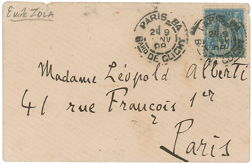 Hand-addressed envelope, 4.25 x 2.75, postmarked Paris, 1888, addressed in Zola’s hand to “Madame Leopold Alberti, 41 rue Francois, Paris.” In very good condition, with scattered toning and soiling, and a pencil notation of Zola’s name in another hand in the return address area.