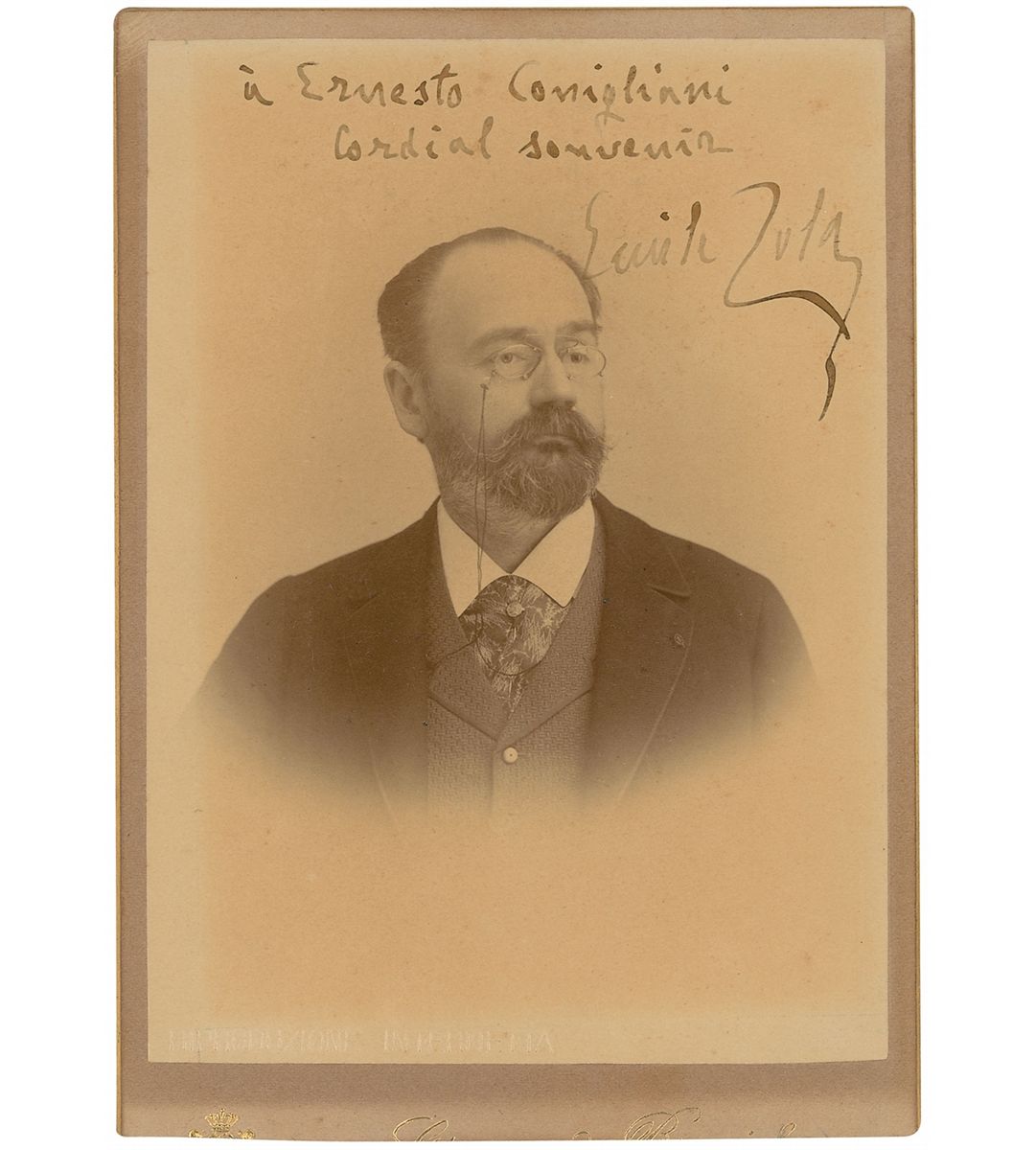 Prolific French journalist, novelist, and activist (1840–1902) best known as one of the leading figures of naturalism and for his inflammatory 1898 open letter, ‘J’Accuse!,’ which exposed the anti-Semitism of the French press and government in the infamous Dreyfus Affair. Original 4.25 x 6 cabinet photo by an unknown Italian photographer, signed and inscribed at the top of the image in black ink, “A Ernesto Conigliani, cordial souvenir, Emile Zola.” In very good condition, with light creasing to the upper left corner of the mount, uniform toning, a trimmed bottom edge, and a few light pencil notations and mounting remnants to reverse.