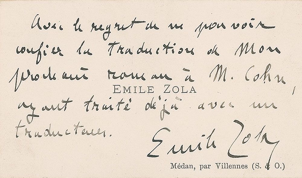 Original personal calling card bearing Zola’s name, 4 x 2.5, signed in black ink below a lengthy note in French, “Emile Zola.” Handwritten note translated in full: "With regret of being unable to confirm the translation of my next novel to Mr. Cohn, I have treated with a translator already." In very fine condition.