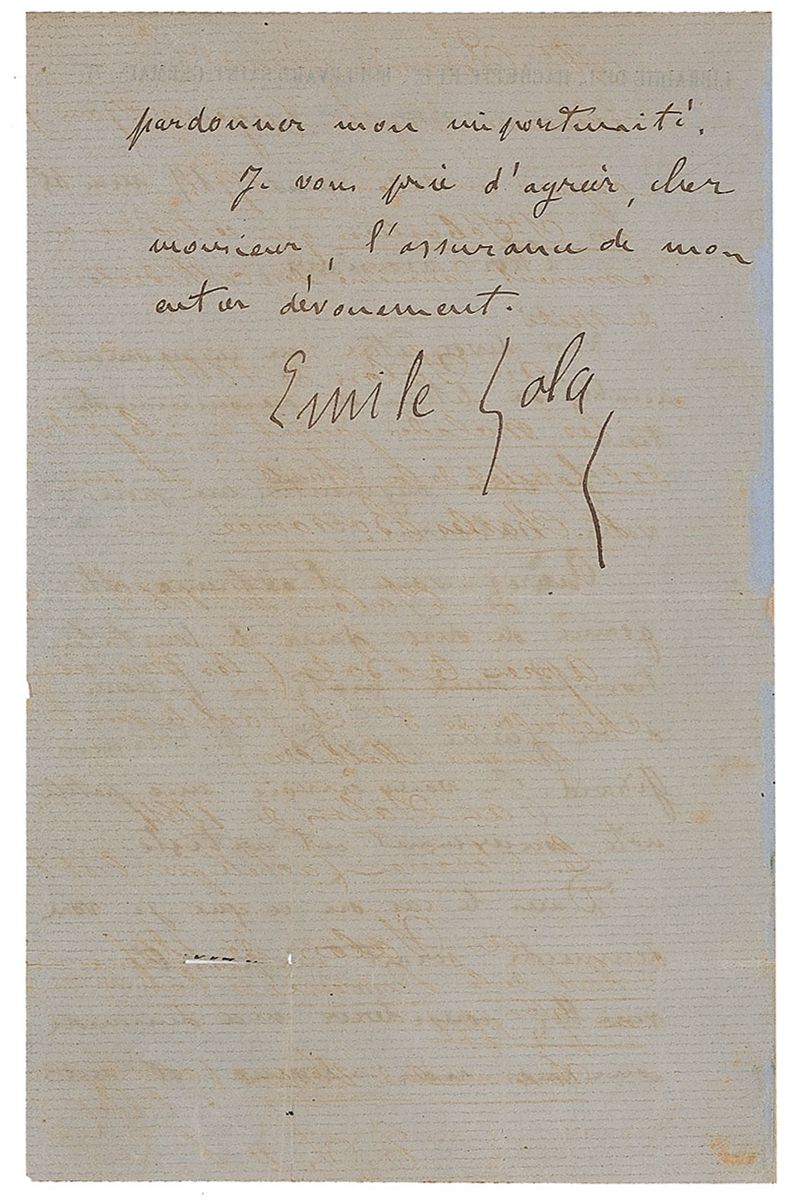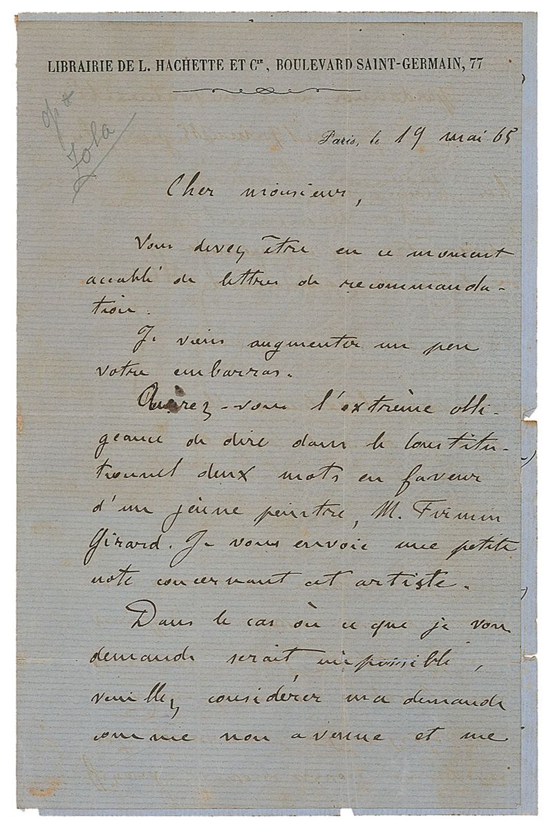ALS in French, one page both sides, 5.25 x 8, Librarie de L. Hachette letterhead, May 19, 1865. An early letter recommending an artist friend, painter Francois-Marie Firmin-Girard. Included is a second sheet in an unknown hand outlining Girard’s biography and career. In very good condition, with intersecting folds, one through a single letter of signature, some mild toning, pencil notation to top of first page, and light show-through from writing on opposite side.