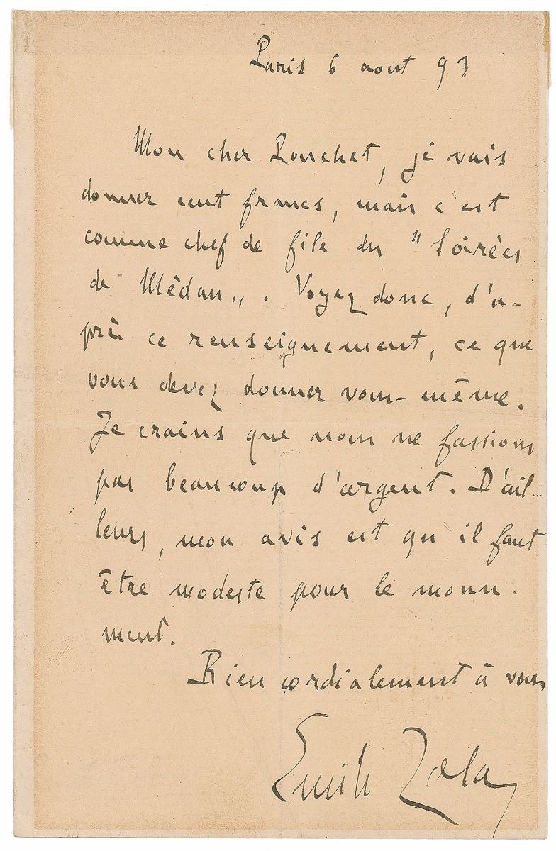 ALS in French, one page, 5.25 x 8, August 6, 1893. Letter to “Ponchet,” in part (translated): “I am going to give one hundred francs, but it is as a leader of the ‘Soirees de Medan.’ See then, according to this information, what you personally have to give. I fear that we are not going to make much money. Besides, in my opinion we must be modest at this time.” In fine condition, with central vertical and horizontal folds and a uniform overall block of toning. Les Soirees de Medan was a collection of six short stories authored by Zola, Guy de Maupassant, Joris-Karl Huysmans, Henri Ceard, Leon Hennique, and Paul Alexis; the title was taken from the name of Zola’s home near Versailles, where the writers often gathered together.