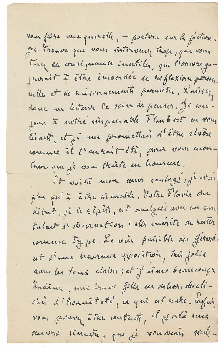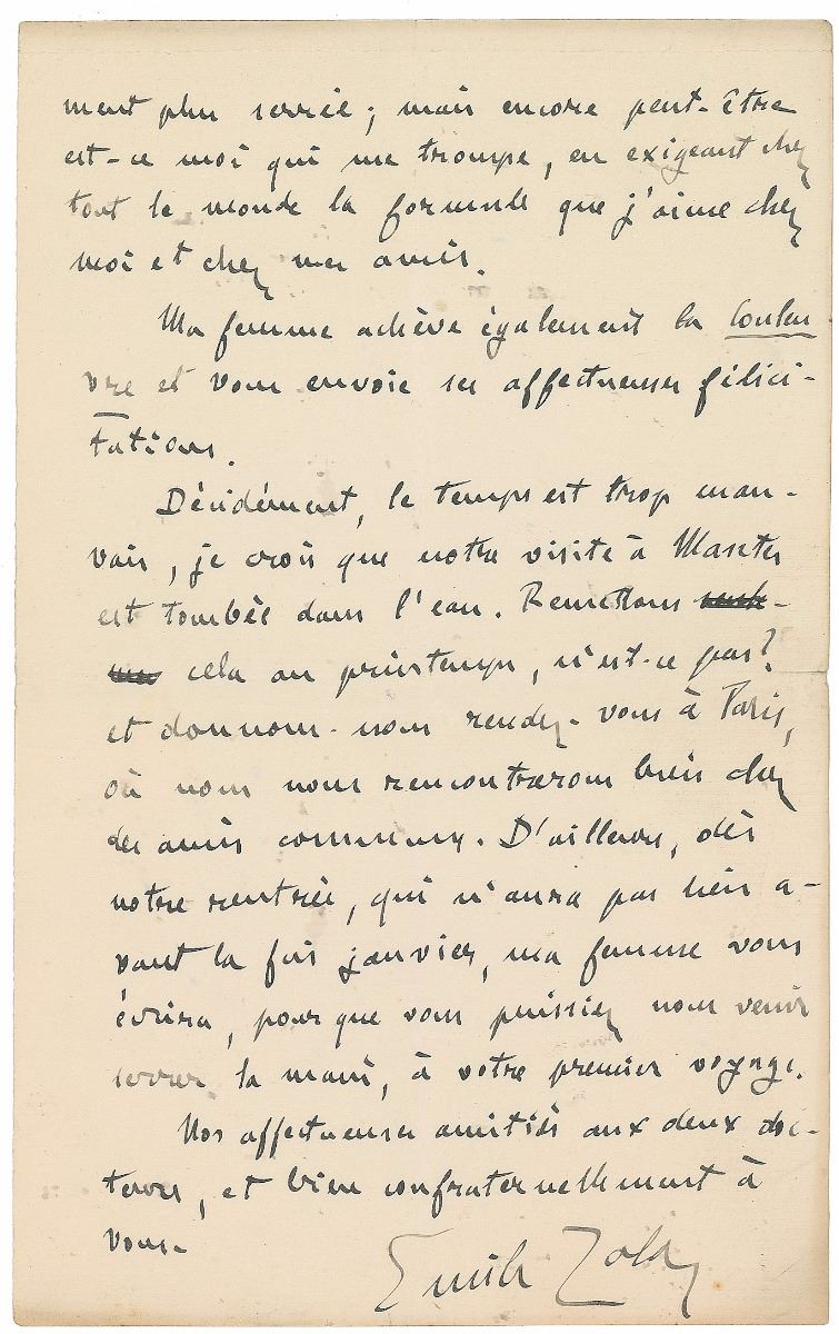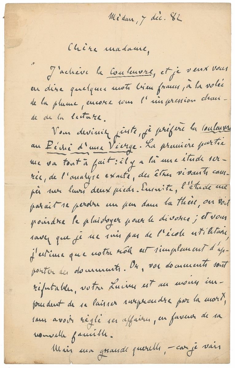 ALS in French, three pages, 5.25 x 8.5, December 7, 1882. Letter offering his thoughts on a piece by a female writer. In full (translated): "I am finishing la Couleuvre [The Grass Snake], and I want to tell you a few frank words about it, at the flight of the pen, still under the reading warm feeling. You guessed right, I prefer la Couleuvre to Peche d’une Vierge [Sin of a Virgin]. The first part is quite well by me: There is there a close study, exact analysis, of people living standing firmly on their two feet. Then, the study seems to me to get lost a little in thesis, we see the defense appearing for the divorce; and you know that I am not from the utilitarian school, I consider that our role is simply to bring documents. Thus, your documents are refutable, your Lucien is at least imprudent to let himself be caught by death, without having settled his affairs, in favor of his new family. But my great quarrel,—because I am going to quarrel with you,—will turn to the invoice. I find that you intervene too much, that you draw useless consequences, that the work would benefit being trimmed of personal reflections and parasite reasoning. So let the reader do their own thinking. I was reflecting upon our impeccable Flaubert while reading your book, and I made myself a promise to be severe as he would have been, to show you that I treat you as a man. There, my heart is relieved, I only have to be kind now. Your Flavie at the beginning, I repeat it, is analyzed with a rare observation talent: She deserves to remain as a standard model. Gerard peaceful corner is of a happy opposition, very nice in clear tones; I like Nadine a lot, a nice girl apart from honesty cliches, what is rare. Finally, you can be happy, there is there sincere work, that I would like only more close to the text; maybe is it me who is wrong, for demanding of everyone the form that I like in me and in friends. My wife is also finishing la Couleuvre and sends you her affectionate congratulations. Undoubtedly, the weather is too bad, I believe that our visit to Mantes fell through. Let’s postpone for the spring, should not we? and let’s arrange to meet in Paris, where we could have a good encounter at common friend’s house. In fact, as soon as we get back, which will not happen before the end of January, my wife will write you, so you can come shake our hands, on your first trip.” In fine condition. A long, boldly penned letter with excellent content as Zola discusses the craft of writing.