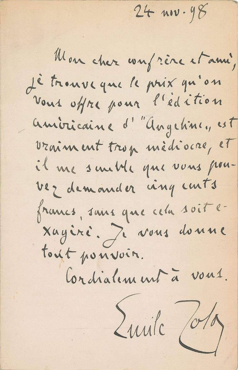 ALS in French, one page, 4.5 x 7, November 24, 1898. Letter concerning an edition of his novella Angeline. In part (translated): "I find the price you offer for the American edition of Angeline is really too mediocre, and I think you can ask five hundred francs.” In fine condition. Zola wrote this letter during his brief exile in London, where he lived from October 1898 to June 1899 after being convicted of libel for his controversial ‘J'accuse,’ an open letter to the French government concerning the Dreyfus Affair.