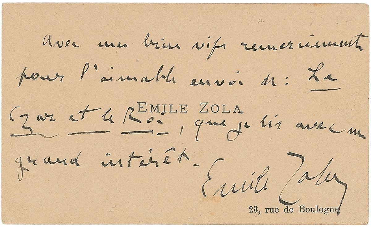 Boldly penned ANS in French on the front of Zola’s personal calling card imprinted with his name and address, 3.75 x 2.25, no date but circa 1900. In full (translated): “With my many thanks for kindly sending me The Czar and the King which I receive with great interest.” In fine condition, with trivial mounting remnants to reverse. Accompanied by the original mailing envelope, addressed in another hand to Monsieur Westphal and postmarked 1900 on the reverse. The Czar and the King was a book by Jules Cornely published in Paris in 1884, and mentions Zola.
